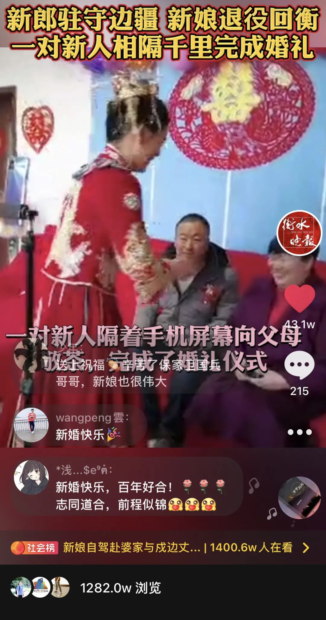 2021年1月30日,衡水市一场“云”婚礼登上热搜。婚礼当日,退役女兵、新娘崔哲独自驾车从娘家出发,来到丽景福苑小区新房内,驻守边疆的新郎周硕全程“云”陪伴,共同完成了这场特殊的婚礼。全国网友向新人表达祝福,大赞他们有担当,“感动国人的爱情,新时代特殊的浪漫婚礼!”人民日报公众号、央视新闻公众号等众多媒体争相报道此事,这对新人被评价为“当代青年人最美的样子”。