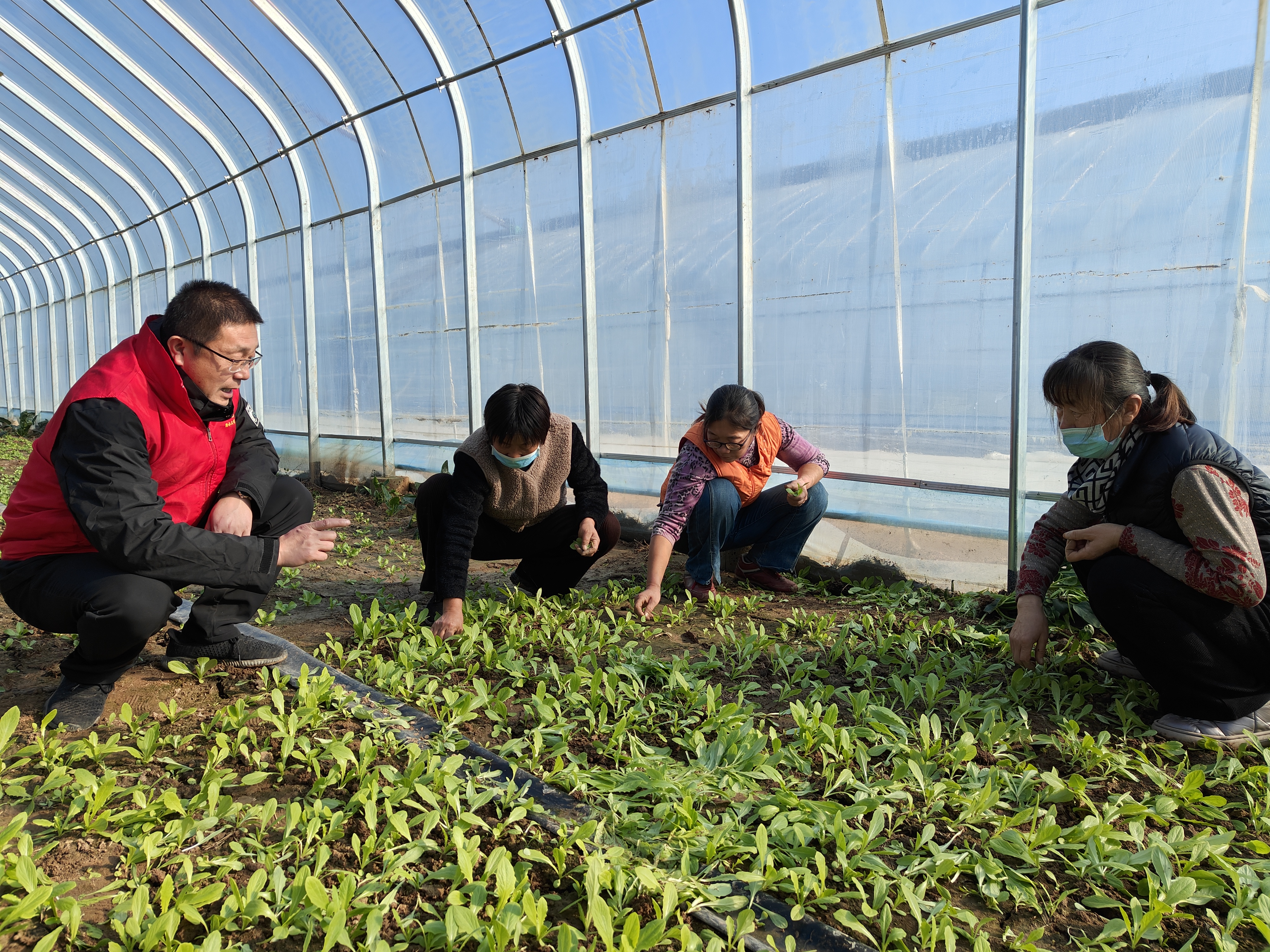 走进村里的蔬菜大棚,一片绿意映入眼帘,菠菜、生菜、油麦菜等长势旺盛。一位身穿红马甲的“小麦穗”成员正蹲在菜地里,和村民说着什么。