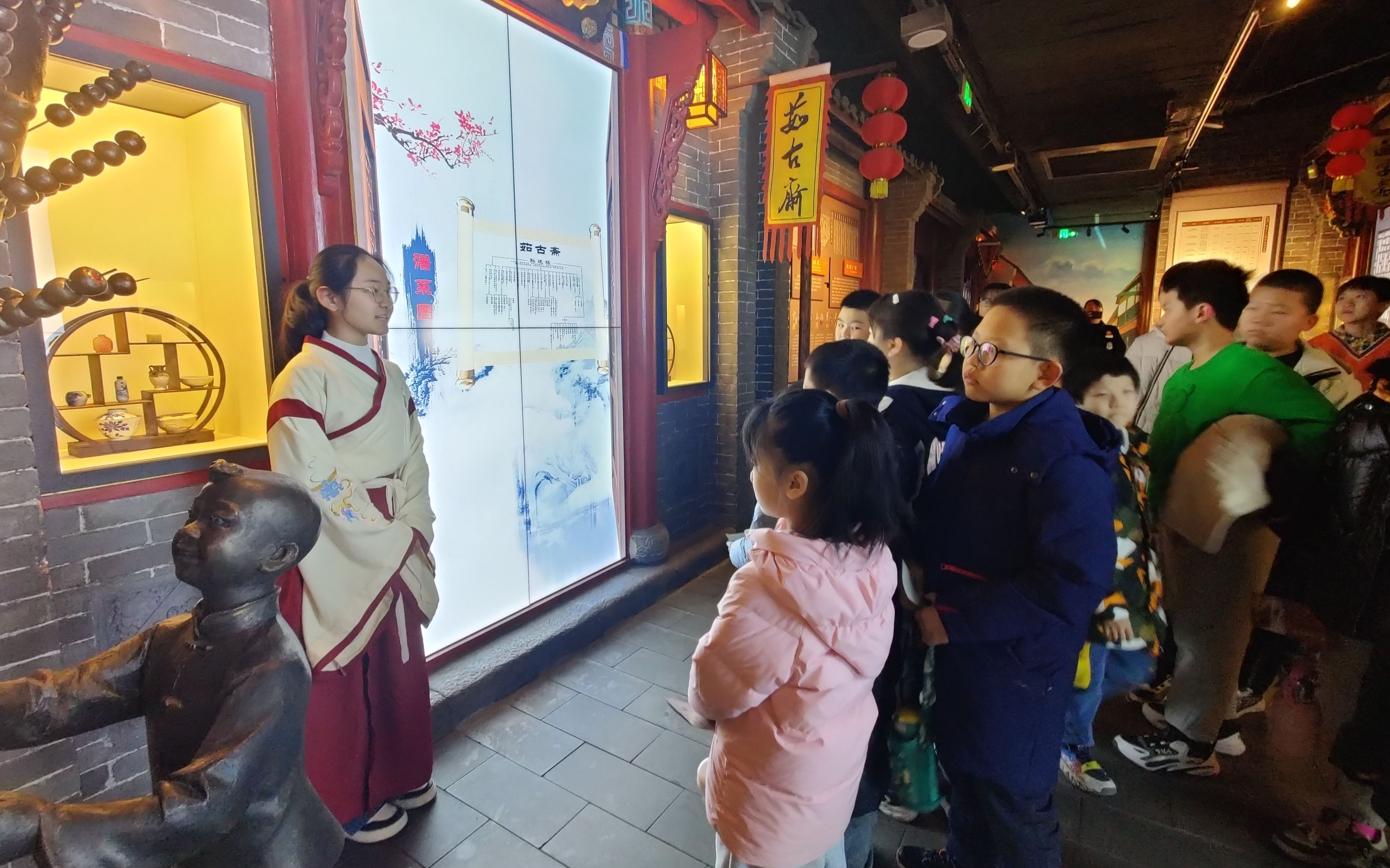 而在博物馆展厅内,小讲解员们则身着古装,热情地为前来观展的观众们讲解。他们站在文物前,用稚嫩的童声带领观众穿越千年,聆听文物故事,了解历史典故,给观众带来了身临其境的参观体验。