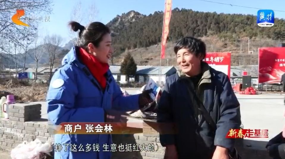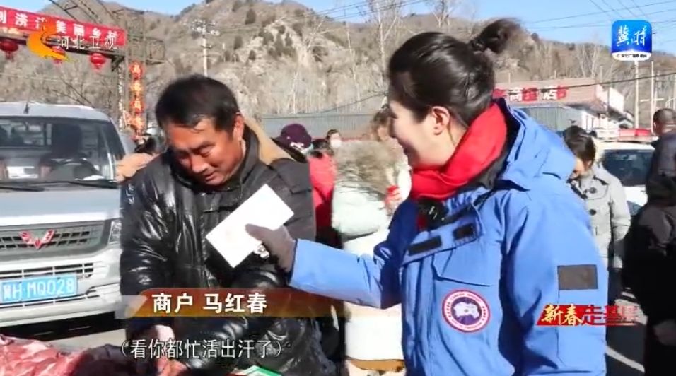 在今天的大集上,当我看到北京游客和老乡们"来来往往"的买卖互动中,我不仅仅是感受到了热气腾腾的年味儿,而且我还感受到了京冀两地地缘相近、人缘相亲的欢喜和融洽。蛇年马上就要到了,看到我身旁这些红红火火的春联,其实也寓意着我们对新的一年最美好的期盼,我也要把饱含祝福的春联送给大家:迎富贵四季平安,接吉祥五福临门。