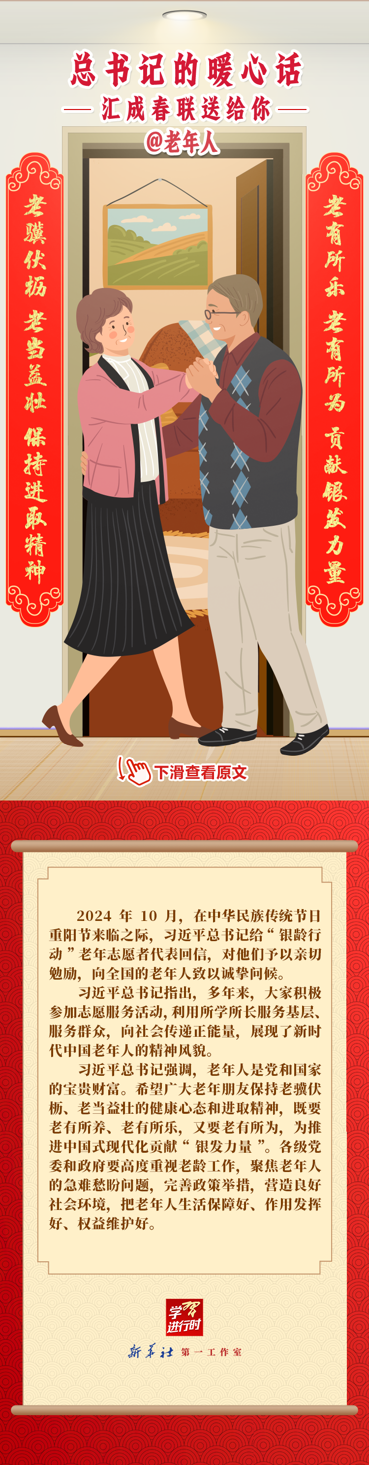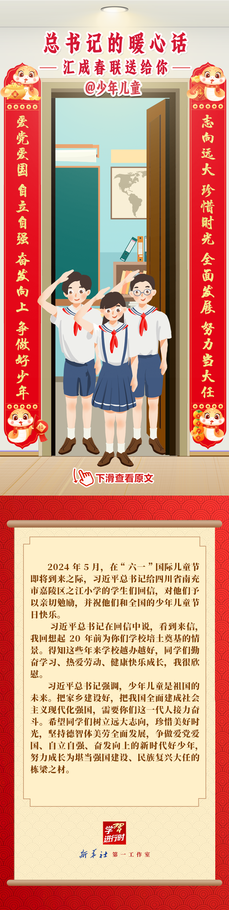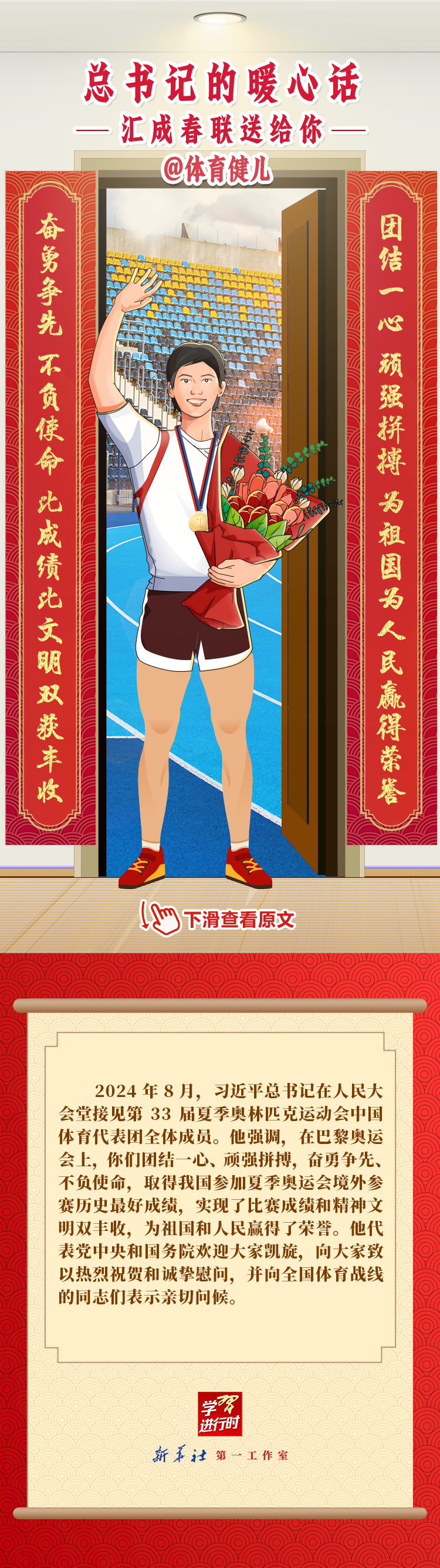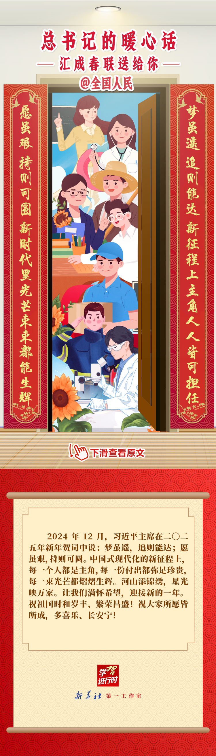 【学习进行时】过春节,贴春联,寄托人们对新年的美好愿望。过去一年,习近平总书记在不同场合点赞各行各业奋斗者,说了许多暖心话。新春之际,我们汇编成联,向新征程上的每一位“主角”致敬,送上新春的祝福。