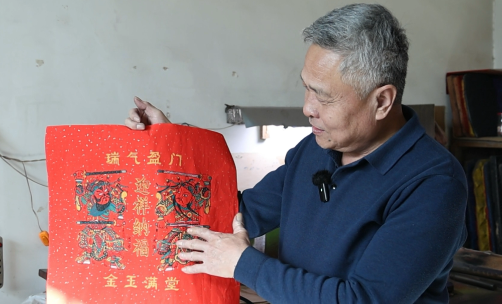 在工作室,他向记者展示了年画《鞭锏门神》:红色洒金宣纸中央,是秦琼、敬德两位门神形象,四周印有“瑞气盈门”“金玉满堂”“迎祥纳福”等吉祥语。