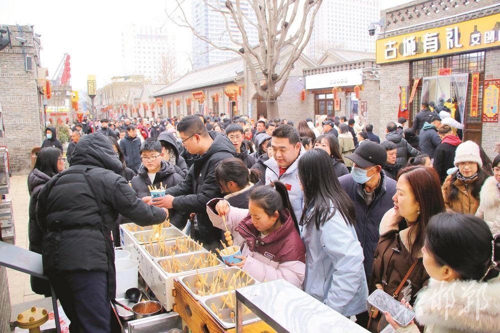 过大年,少不了的便是品年味。邯郸道街区的空气中弥漫着各种美食的香气,独具特色的成语咖啡成了新潮宠儿,“老字号”二毛烧鸡是游客喜欢的伴手礼,太行山的小米煎饼店门前排起了长龙。