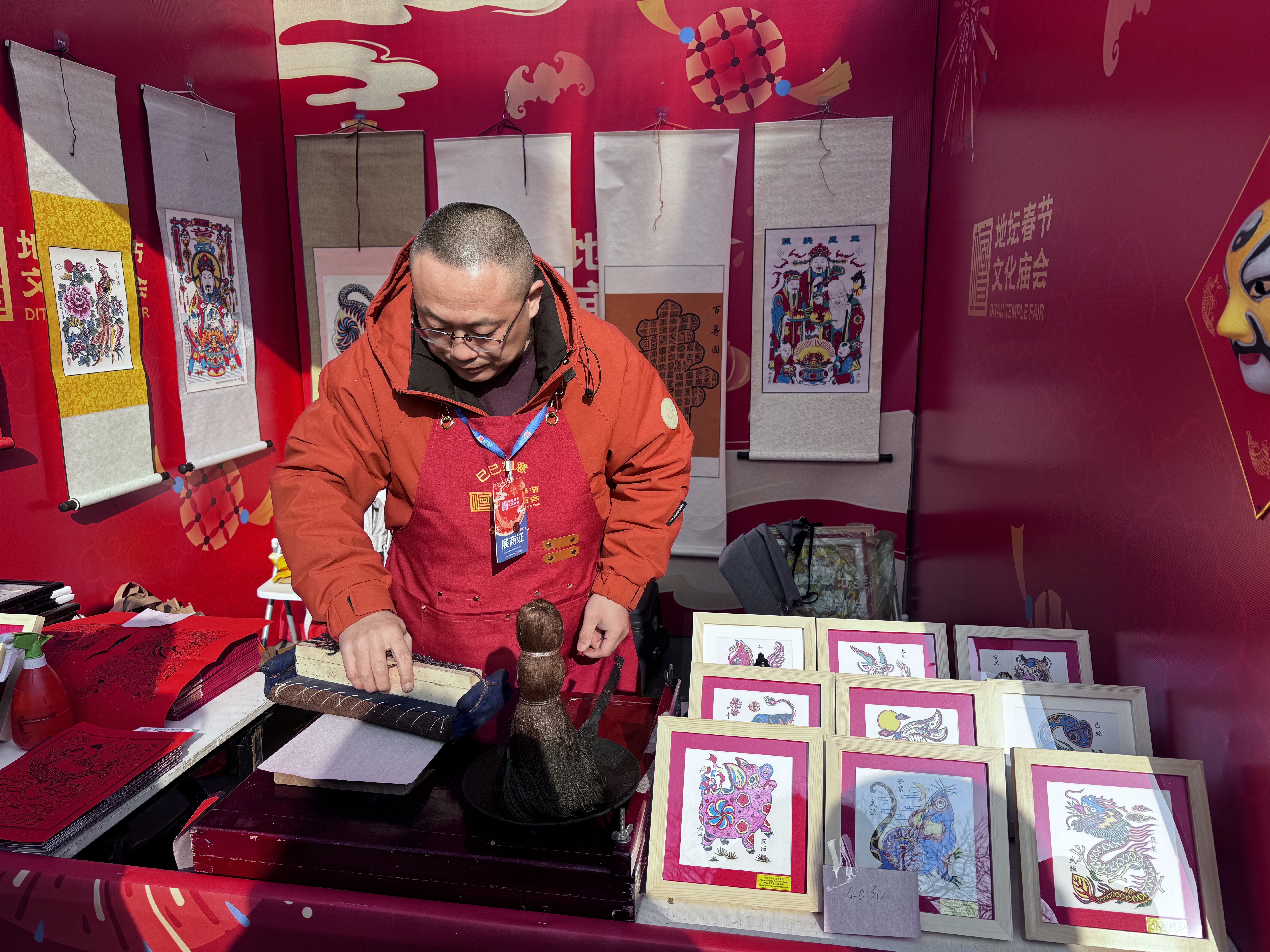 1月30日上午,第37届北京地坛春节文化庙会上,武强年画艺人徐晓毅向游客展示年画拓印技艺。(武强年画博物馆供图)