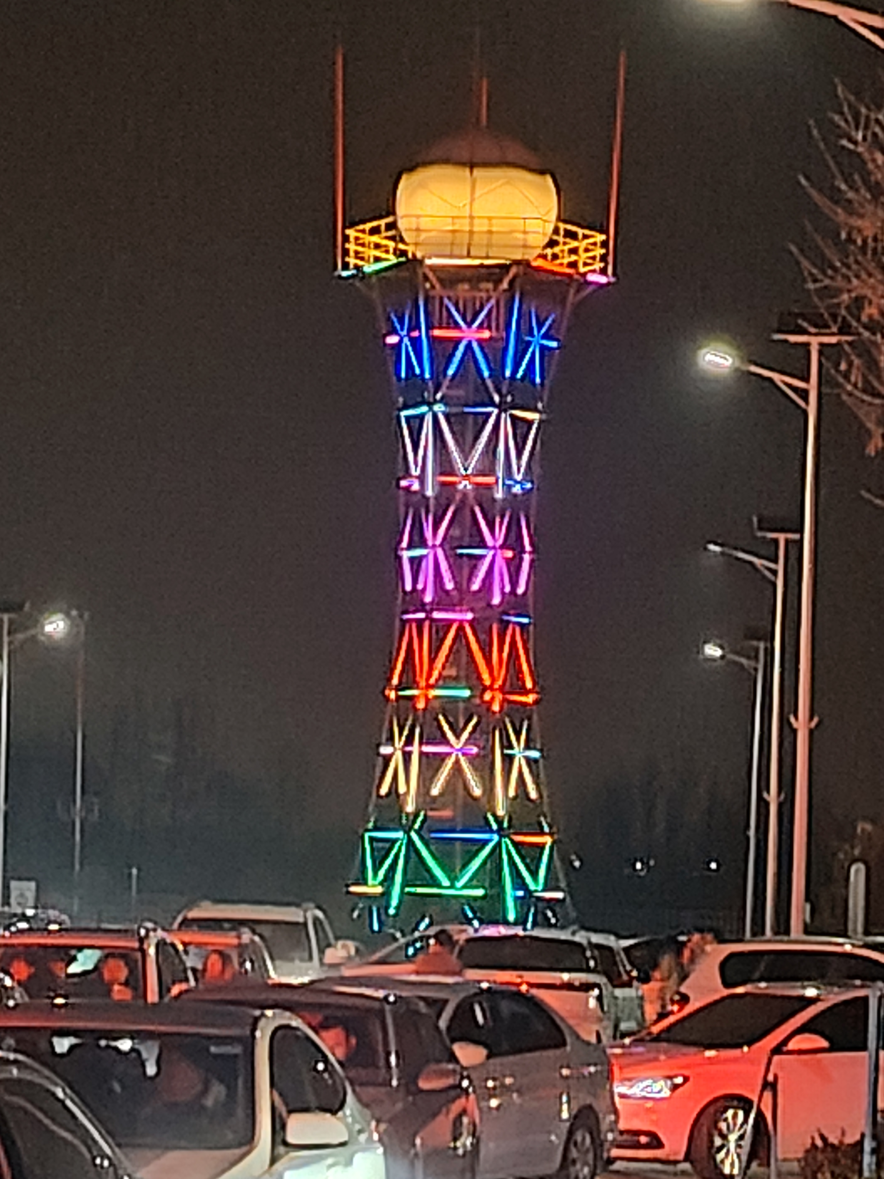 每当夜幕降临,高耸的雷达塔身披数千盏LED灯,时而如银河倾泻,时而似极光流转,动态灯光随节日音乐律动变幻。塔顶的雷达天线罩则被装饰成巨大的“灯笼”,与园博园传统花灯交相辉映。“没想到冰冷的雷达设备能这么美!”带着孩子参观的李女士赞叹,“既看到了年味,又给孩子科普了气象知识。”