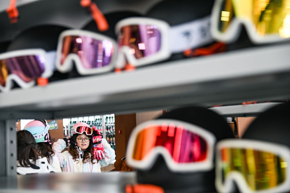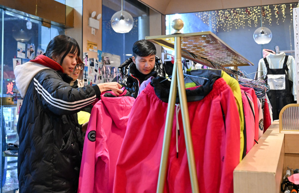 2025年1月23日,游客在湖北神农架林区木鱼镇街边一家店铺挑选雪具雪服。自然天成的地理环境造就丰富的冰雪资源,也给当地运动装备销售、租赁行业带来了商机。