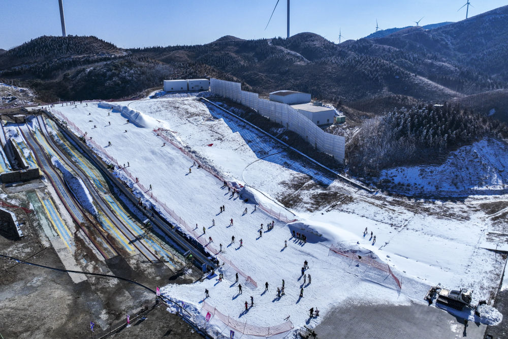 2025年1月23日,游客在湖北神农架中和国际滑雪场滑雪。湖北省神农架林区冬季降雪量丰富、雪质蓬松,为中部地区滑雪爱好者提供了良好的练习环境。