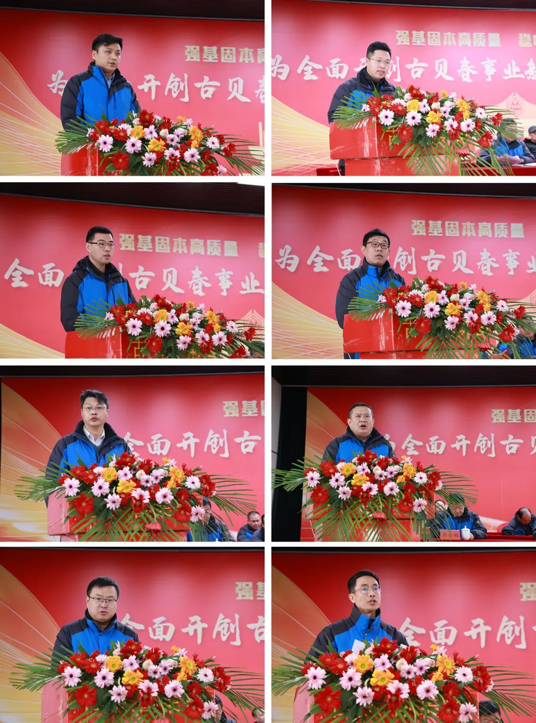 ▲营销公司、生产技术、行政后勤等部门的8名代表同志分别上台表态发言
