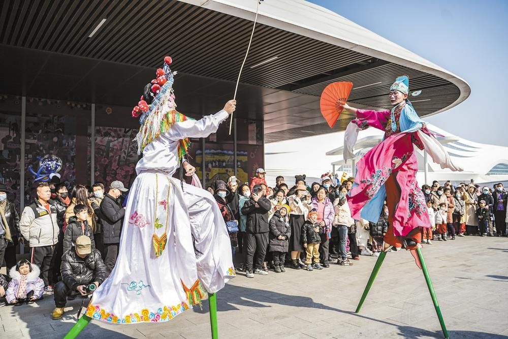一墙之隔的水云间文化商街,同样沉浸在浓郁的传统年味之中。胜芳小河西青荷高跷会、陕味演唱、川剧变脸、敦煌胡旋舞,还有舞龙和小车会等非遗表演轮番上演,吸引众多游客的目光。在非遗市集,手工艺品琳琅满目,传统小吃的香气弥漫在空气中。