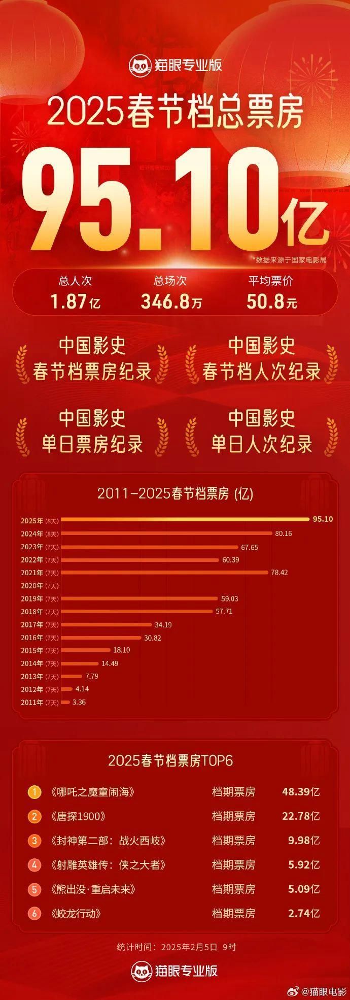 要说今年最火爆的消费场景当属各大影院。据国家电影局统计,截至2月5日9时,2025年春节档总票房95.10亿,总人次1.87亿,刷新中国影史春节档票房、人次纪录!排在前三的分别是:《哪吒之魔童闹海》以及《唐探1900》《封神第二部:战火西岐》。