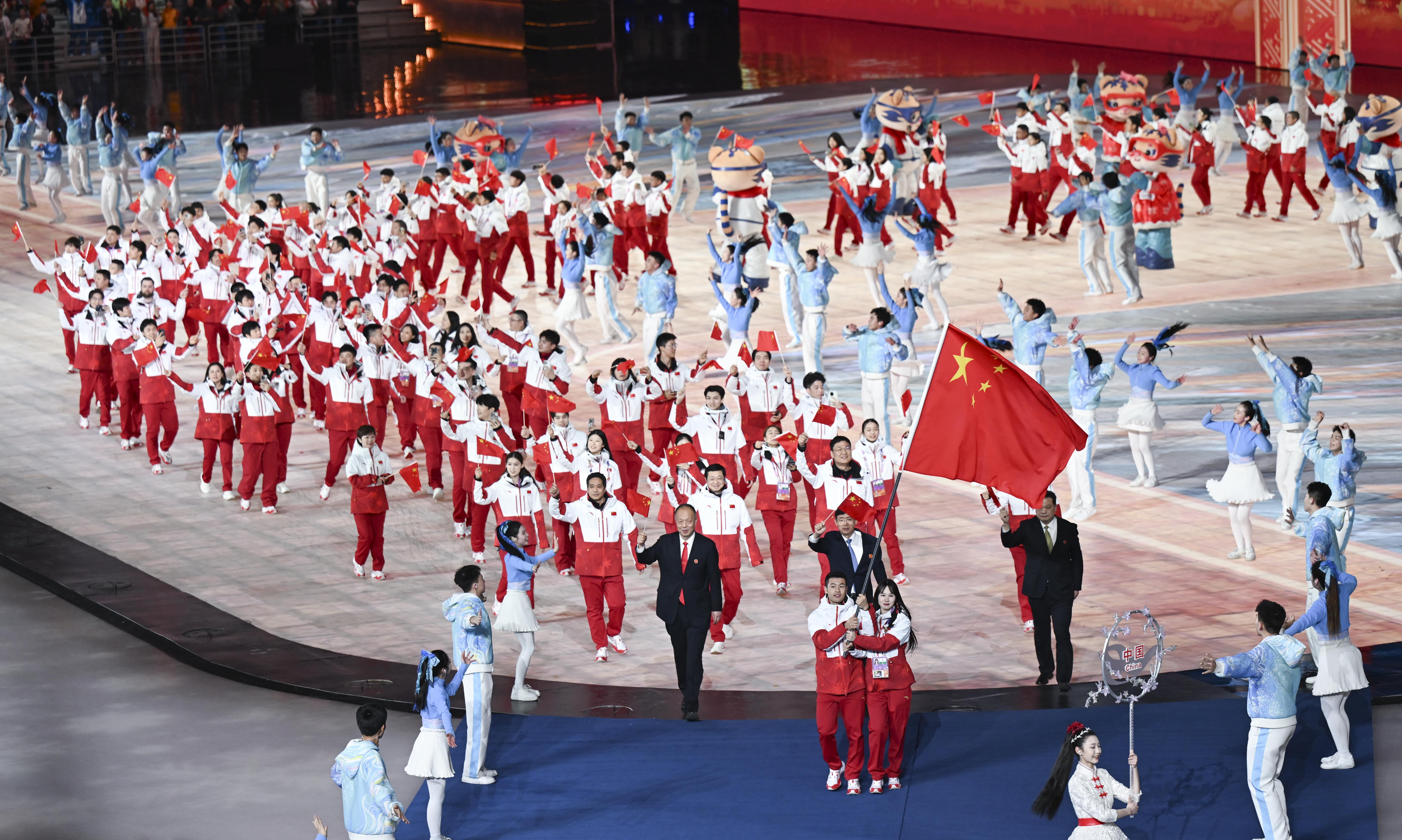 哈尔滨亚冬会开幕式上,中国体育代表团入场。图片来自新华社