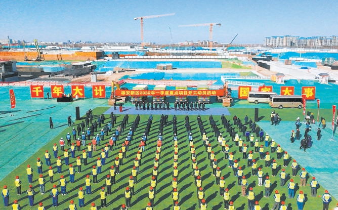 2月5日,农历蛇年第一个工作日,河北雄安新区启动区金融岛站周边一体化开发项目工地上,红旗飘飘,机械齐鸣,雄安新区2025年春季重大项目集中开工仪式举行,70个重大项目同时启动。