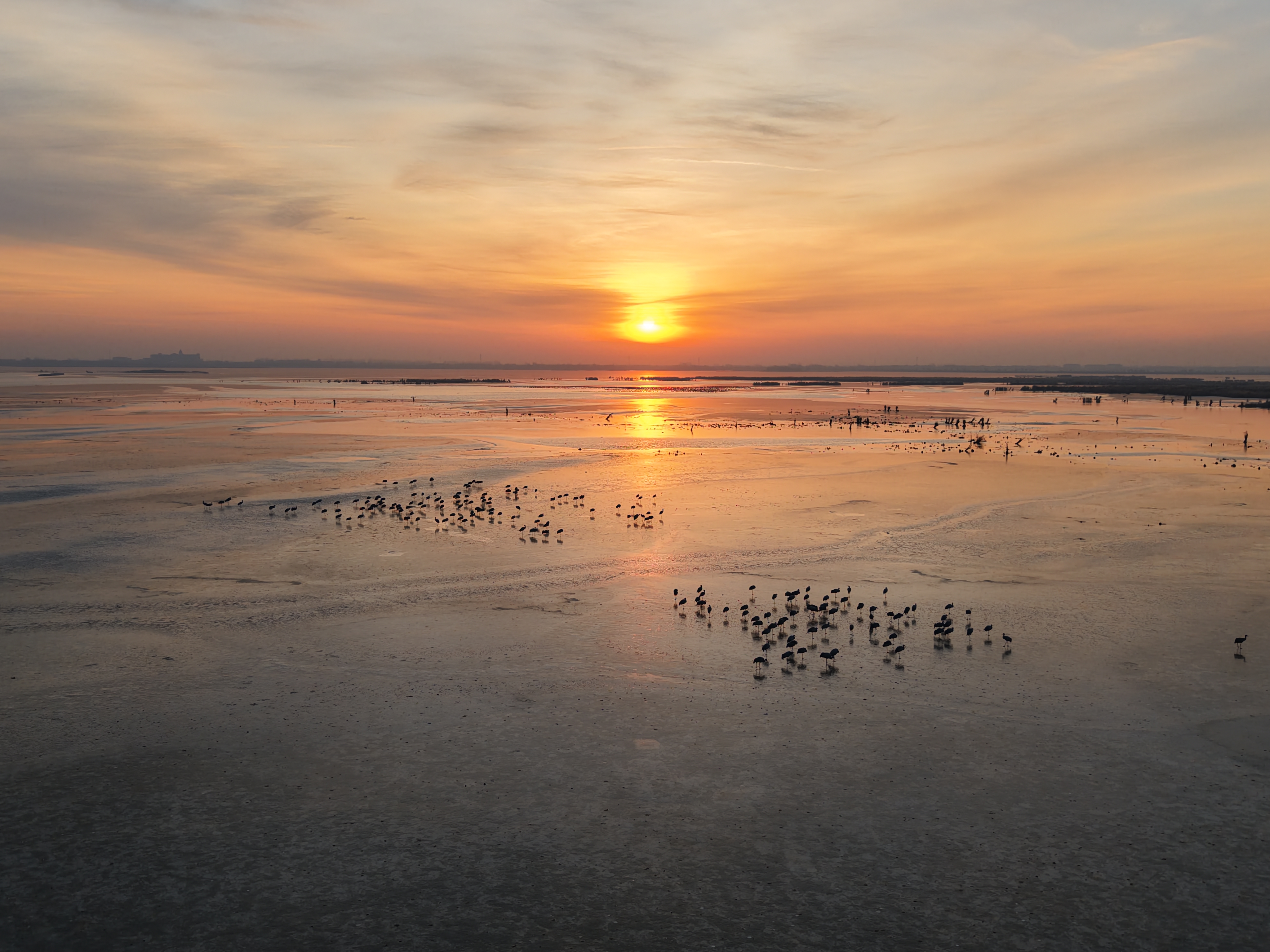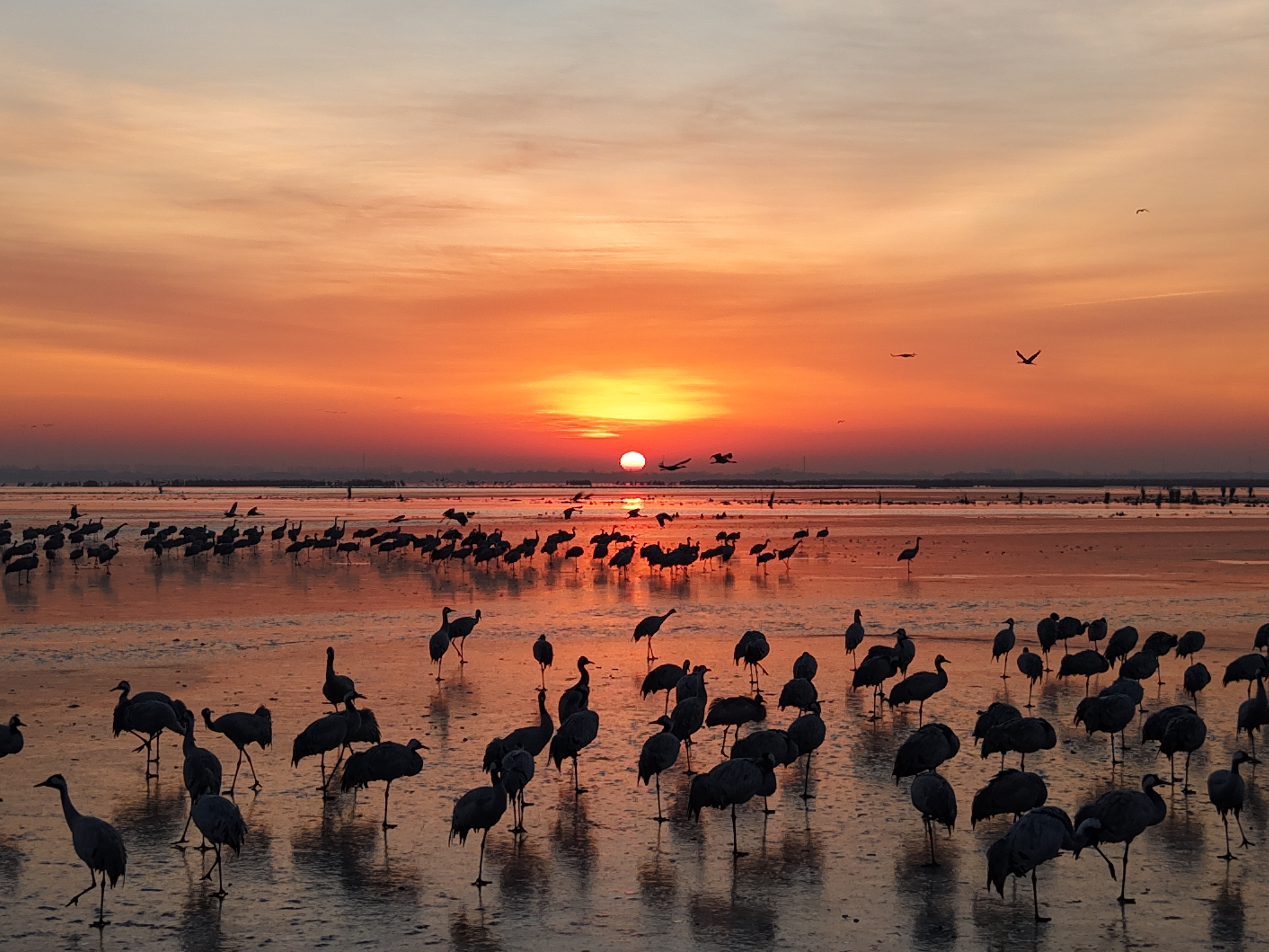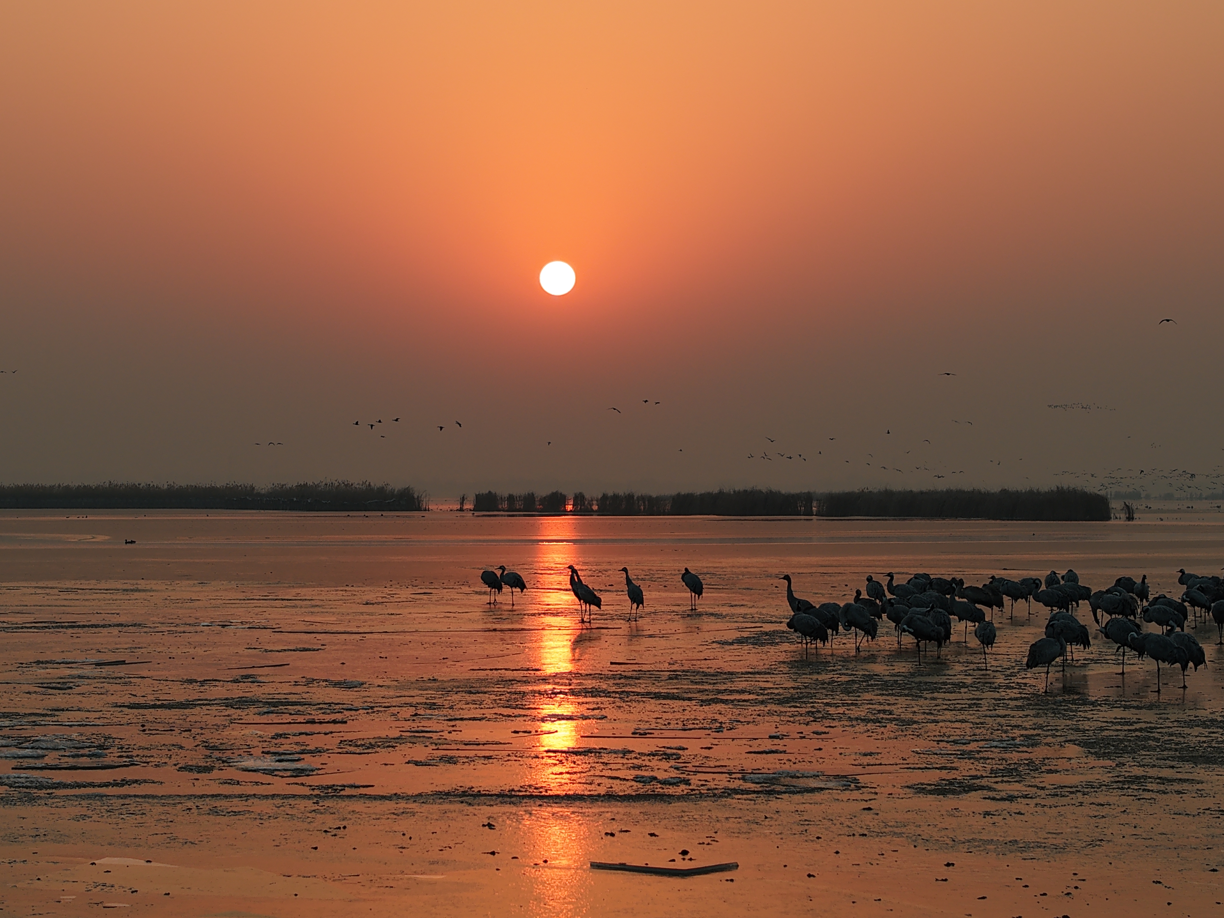 朝阳缓缓升起,霞光使冰面变得金碧辉煌。站在段村放眼望去,在衡水湖的湖面上,可以看到成群的灰鹤在翱翔、觅食、嬉戏。这些优雅的灰鹤或翱翔于蓝天之上,或漫步于浅滩之间,与衡水湖的美景相互映衬,展现出一幅幅生态和谐的美丽画卷。