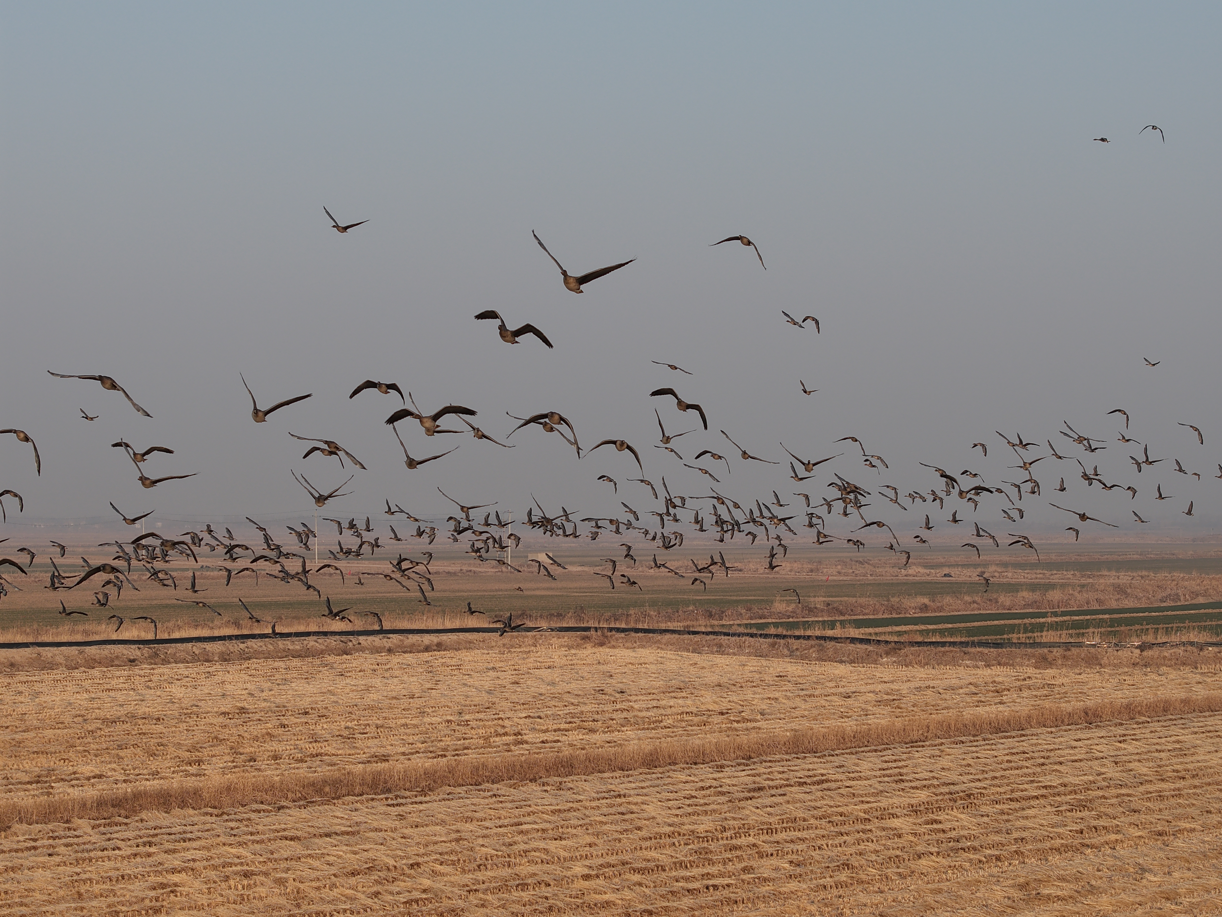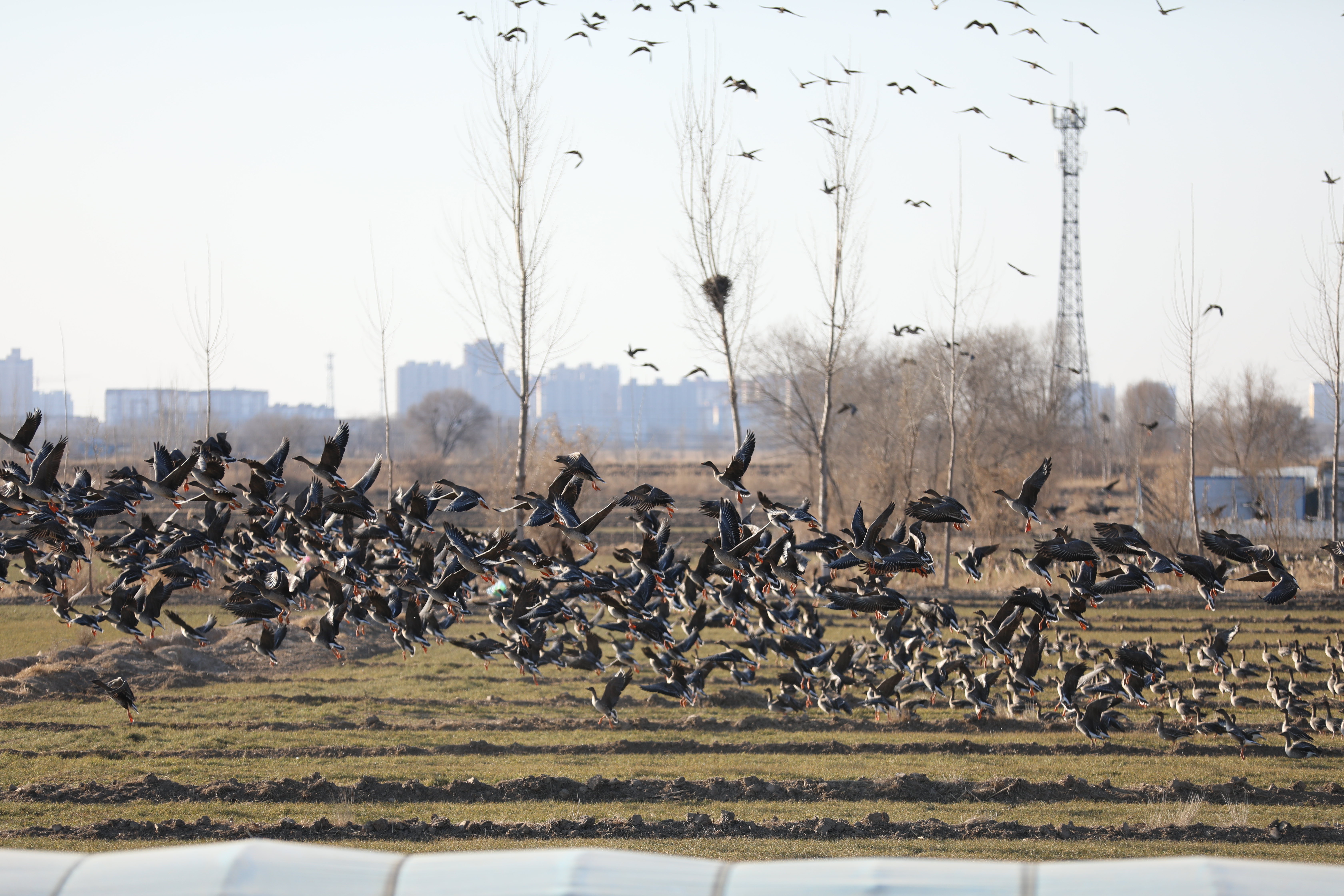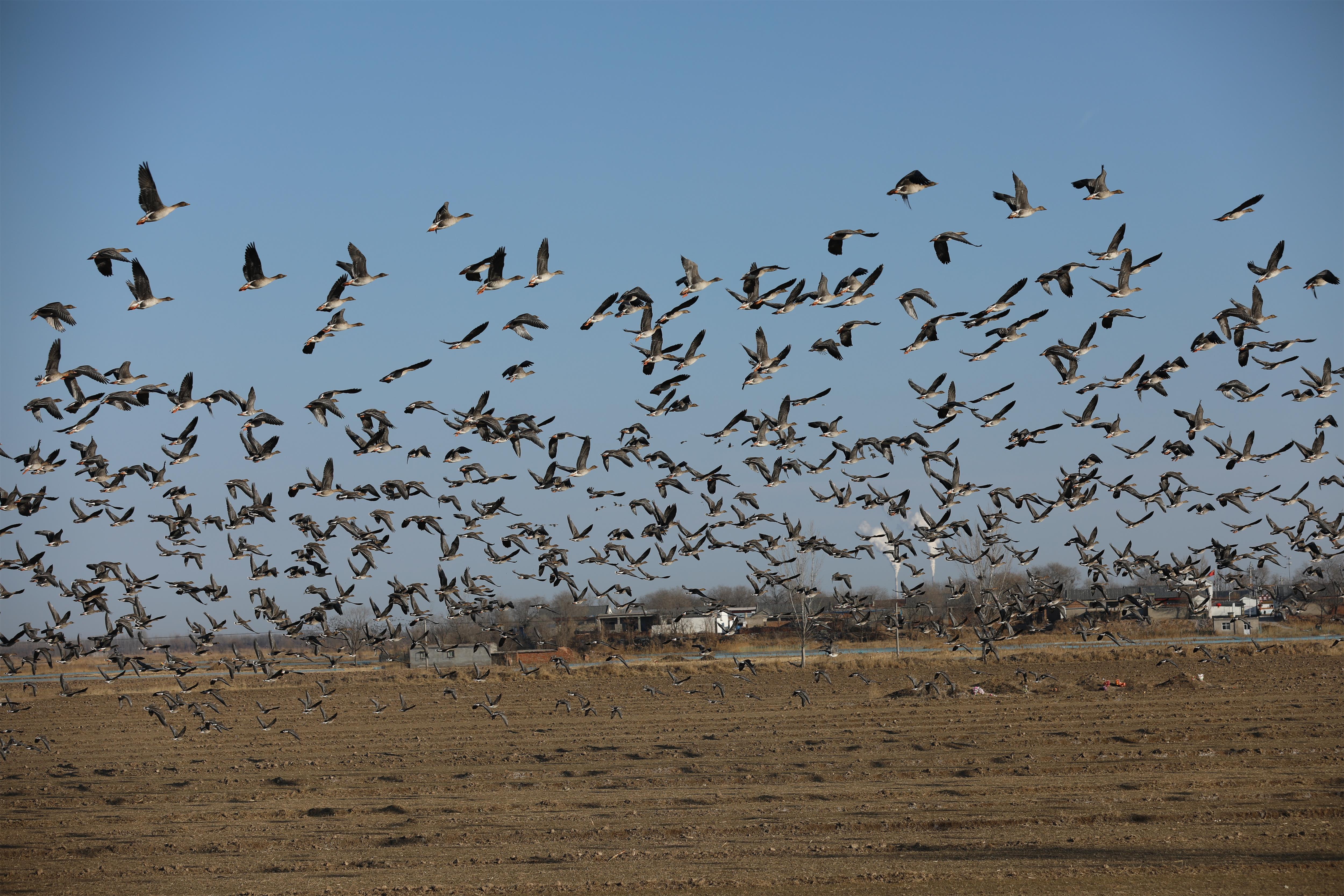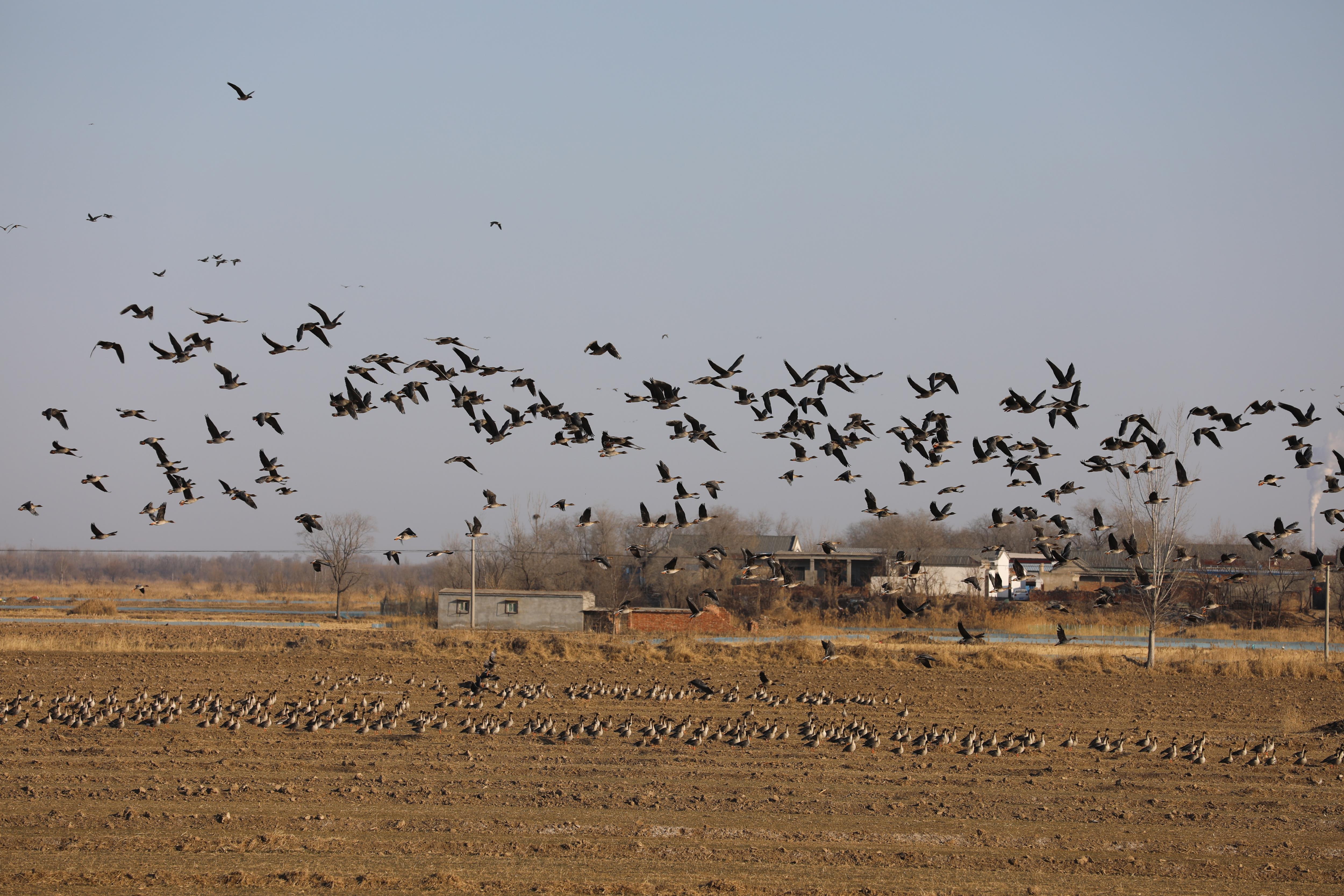 瞧,在衡水湖畔附近麦田地上空,成千上万只大雁聚集。只见大雁有的发出 “嘎嘎” 声,仿佛是在相互交流着觅食的心得;有的围在一起窃窃私语,展现出悠闲自得的状态;有的警惕地抬头观察四周的动静……此时,一只大雁突然振翅高飞,其他雁类迅速跟随,它们两翼平展,展露背羽飞向高空,或排成人字形,或排成一字形,展翅高飞,形成了独特的“雁浪”奇观,场面蔚为壮观。