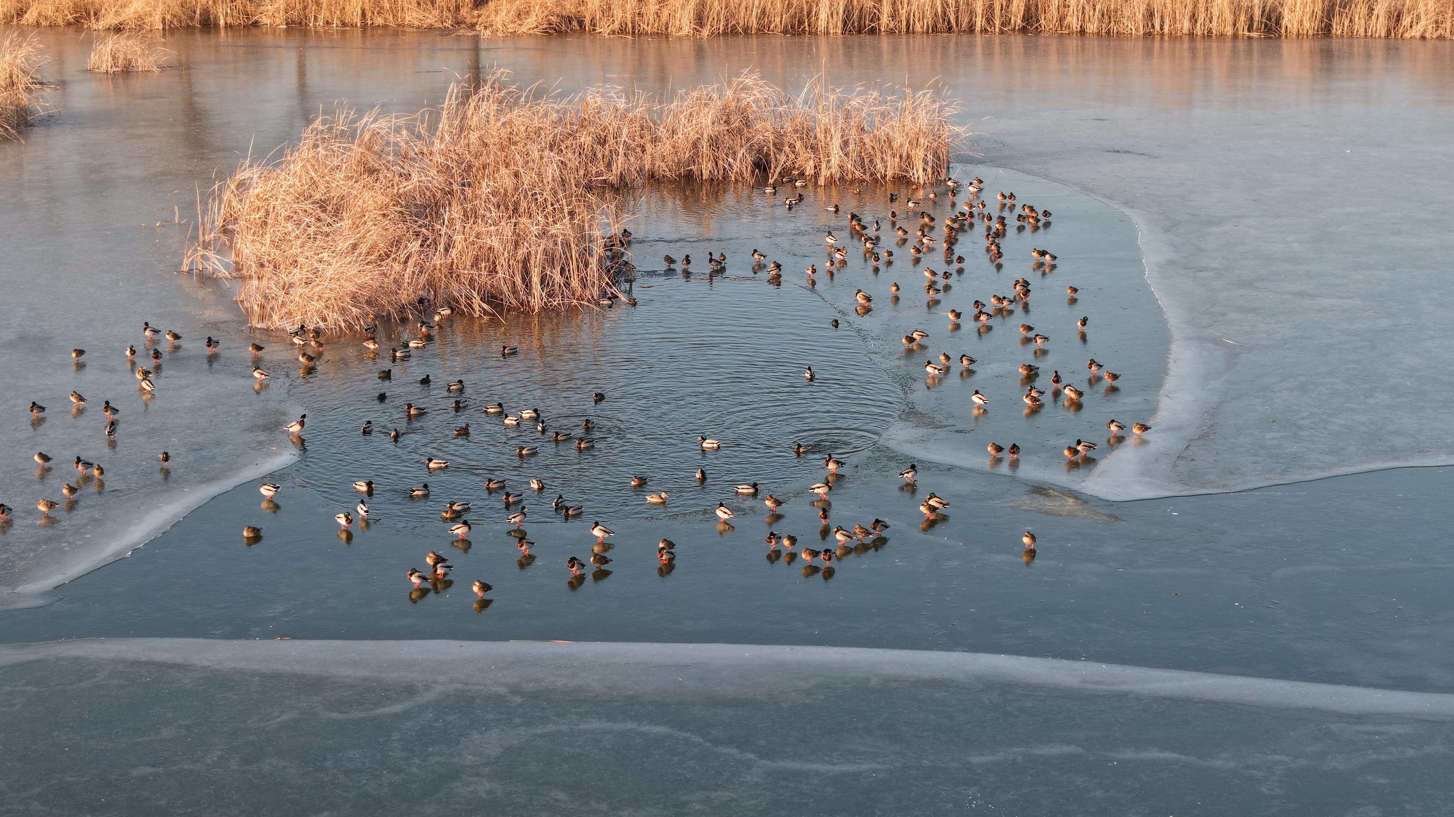 一群绿头鸭正悠然自得地在冰面上觅食。绿头鸭头部的羽毛呈现出深邃而华丽的绿色,它们的颈部则环绕着一圈醒目的白色羽毛,恰似优雅的白色围巾,与墨绿色的头部形成鲜明对比。它们用扁扁的嘴巴在冰面的缝隙间、在浅浅的水洼中探寻着食物,偶尔发出 “嘎嘎” 的叫声,仿佛在分享着找到美食的喜悦。