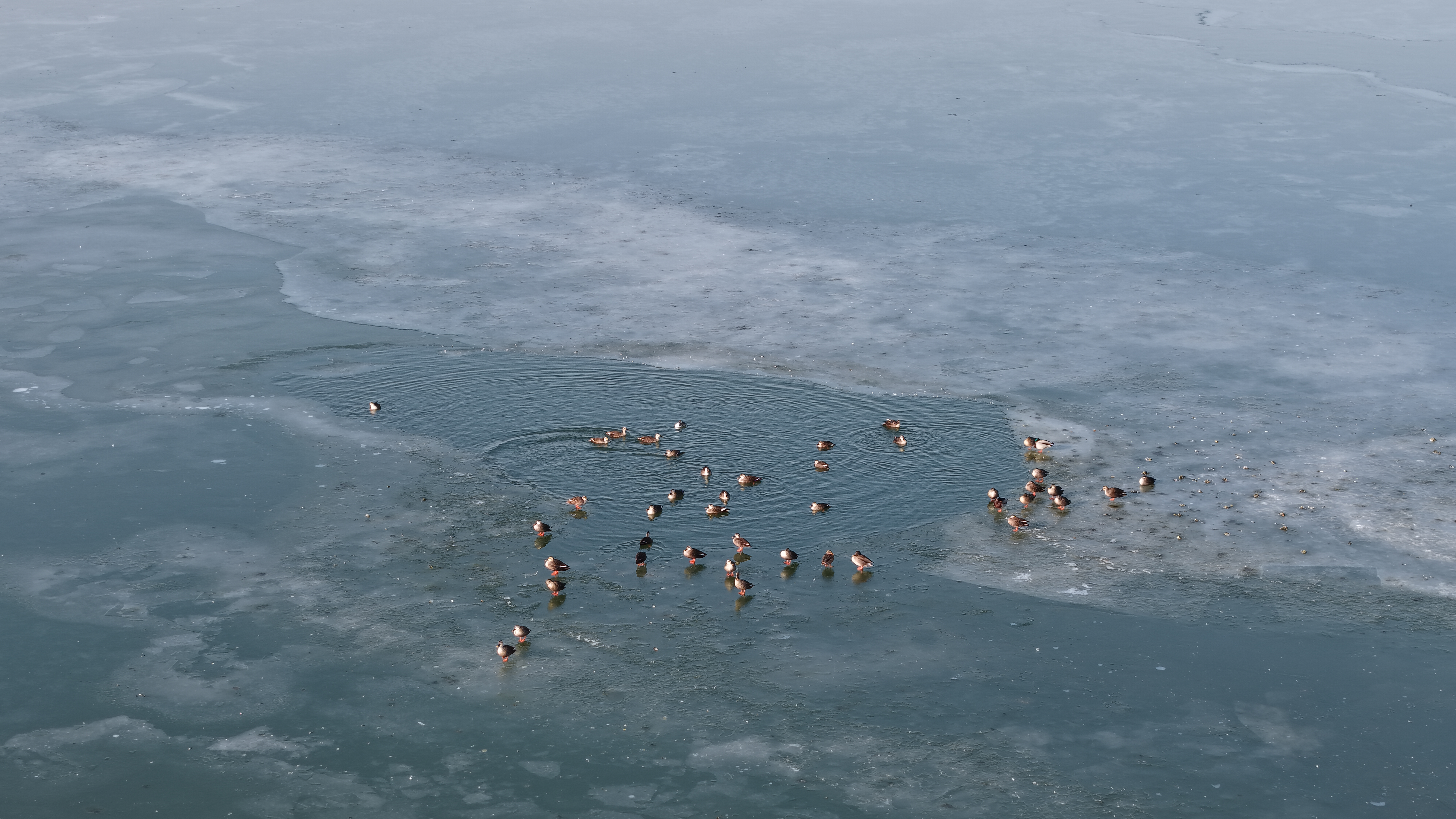 在这众多鸭类中,尤为珍稀的当数青头潜鸭。它们体型小巧,却有着独特的魅力,眼睛呈白色,宛如夜空中闪烁的星辰,醒目而灵动。它们常悄然藏于鸭群,时而趁鸭群喧闹,轻游至冰面边缘水草密处,动作轻盈如微风拂水。时而头扎入水中,凭借灵活身姿在水下觅食,眨眼消失,只留涟漪,为这片充满生机的冰面,更添了一份神秘与珍贵。