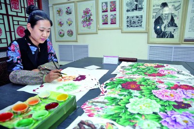 河北省蔚县“剪纸侯”工作室的工作人员正在为剪纸上色。何大为摄