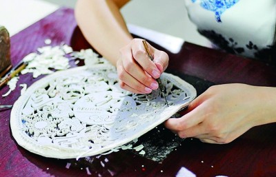河北省蔚县剪纸艺人在进行刻纸。刘利锋摄