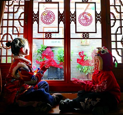 河北省蔚县当地小朋友在粘贴剪纸窗花。河北省蔚县县委宣传部供图