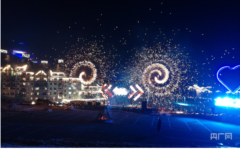 夜幕降临,在太舞滑雪小镇,非遗技艺打铁花、火壶等多场表演呈现出“火树银花”般的奇幻效果。“太震撼了!非遗匠人从高处打铁花,好像无数星斗从天空中坠落而下。”打铁花四散的火花与艺人舞动的身影打造出红红火火过大年的场景,让来自全国各地的游客赞不绝口。