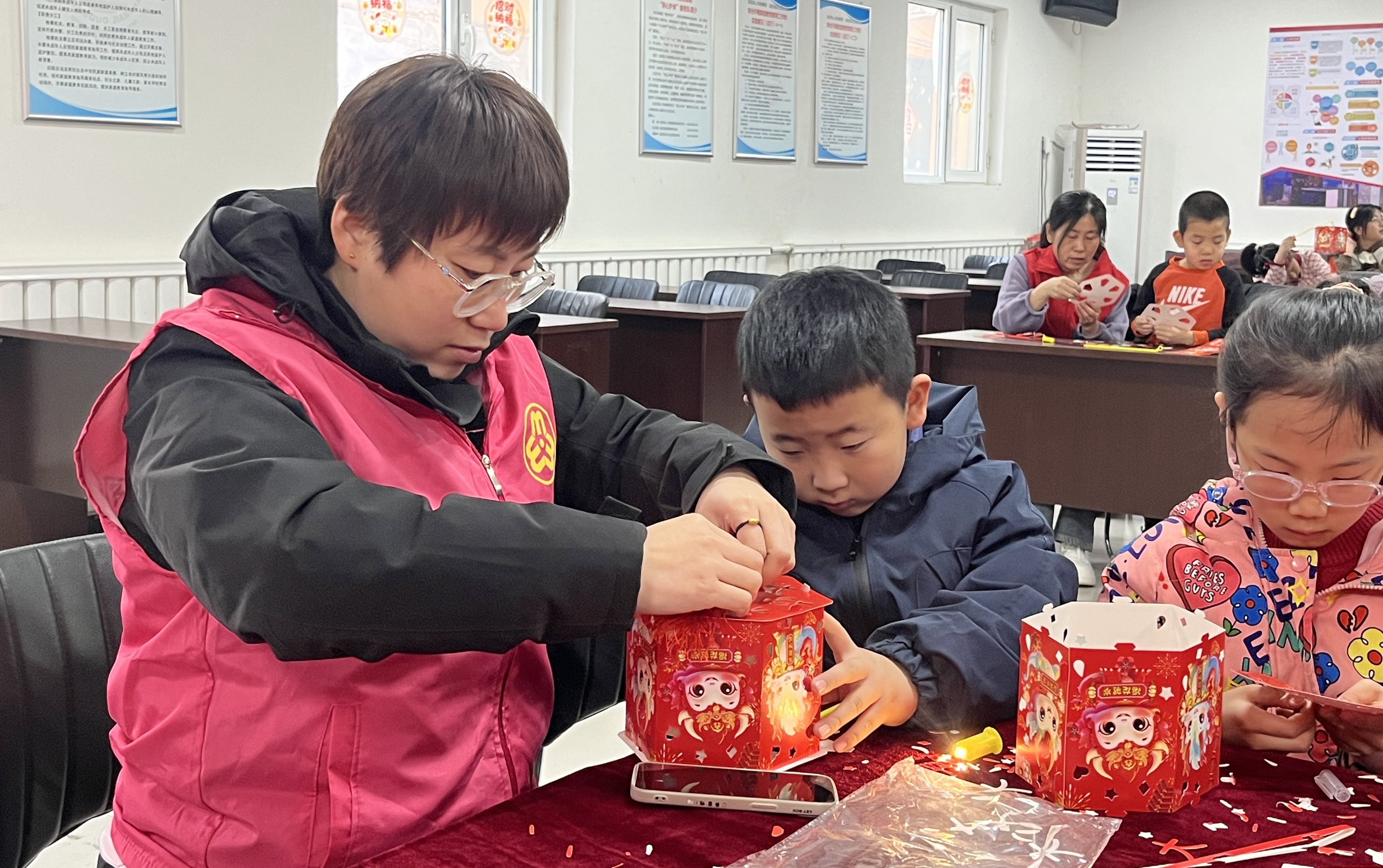现场,一群活泼可爱的孩子们便迫不及待地在武罗社区工作者的悉心指导下,投入花灯制作之中。桌上摆放着各式各样的制作材料,彩纸、剪刀、胶水等一应俱全。孩子们眼中闪烁着兴奋与好奇的光芒,纷纷拿起材料,开始构思属于自己的花灯。在剪、粘、折的过程中,孩子们全神贯注,小手灵活地穿梭在各种材料之间。不一会儿,形态各异、色彩斑斓的花灯便在孩子们的巧手下诞生了。