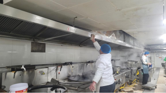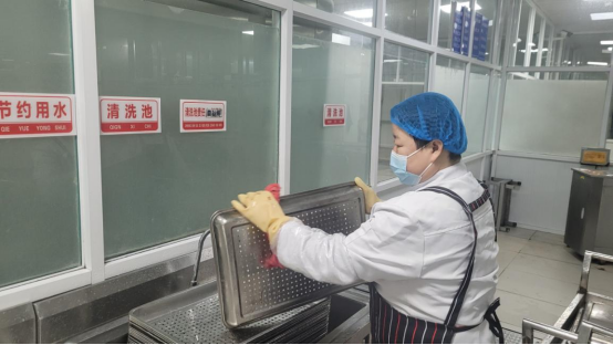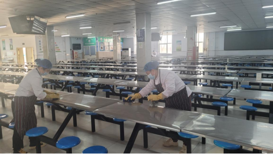 食堂职工于2月10日全员到岗,对食堂餐具等进行高温物理消杀,就餐区域以及地面按照不同浓度配比进行消杀,对设备设施进行安全隐患全面检查,对食堂环境卫生进行全面清洁消毒。学校从小处着眼、细处着手,确保食堂所有员工持有效健康证件上岗,全力保障全体师生第一餐。