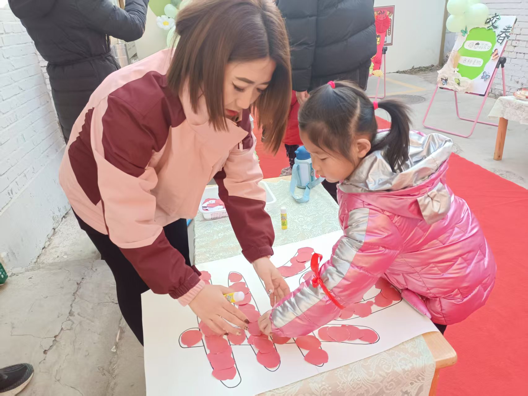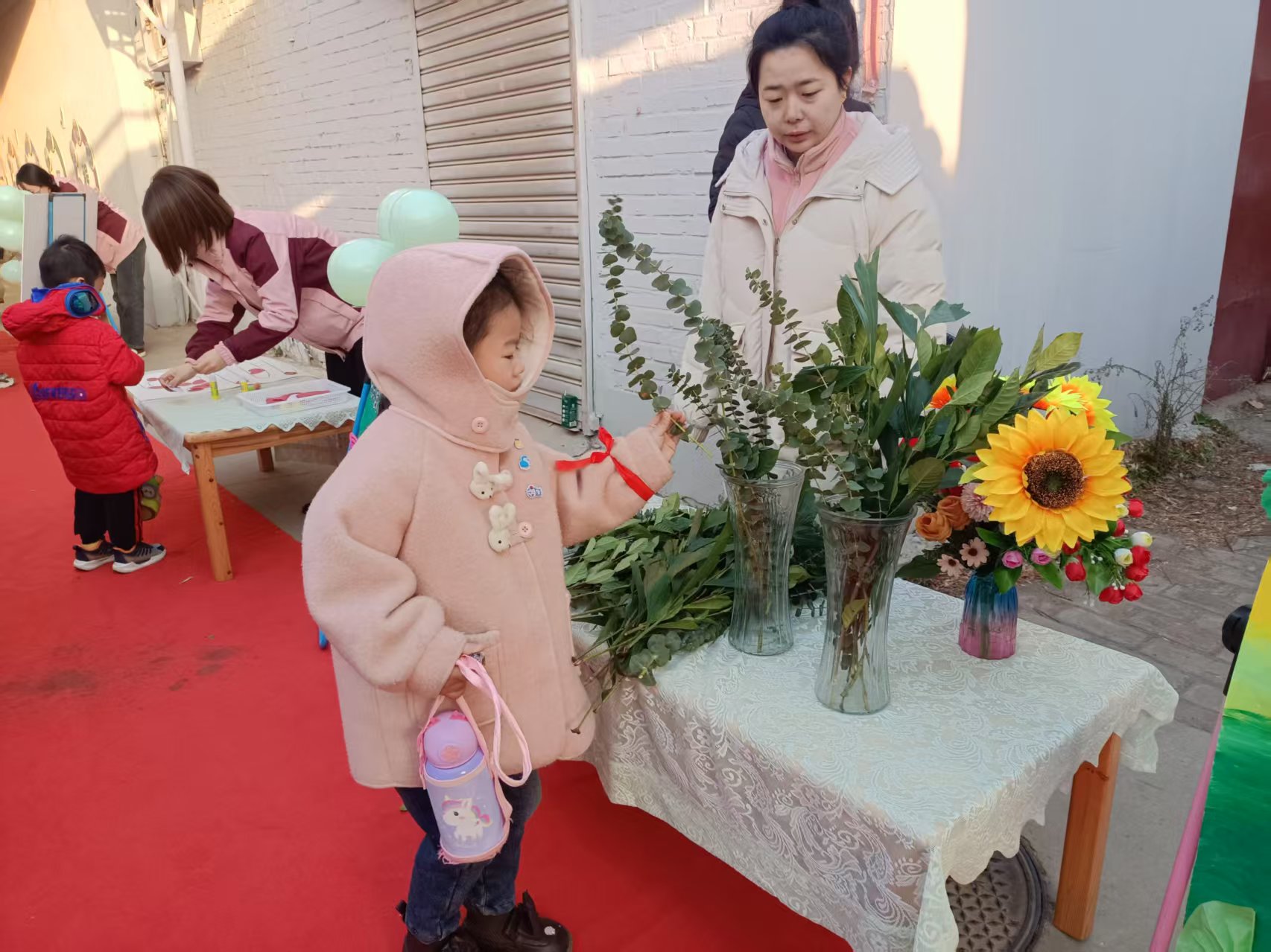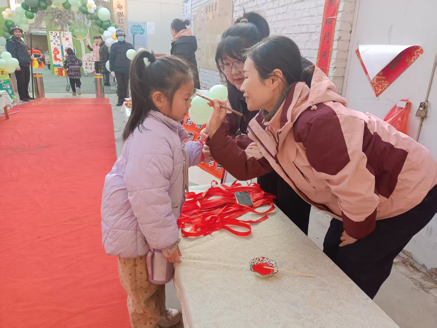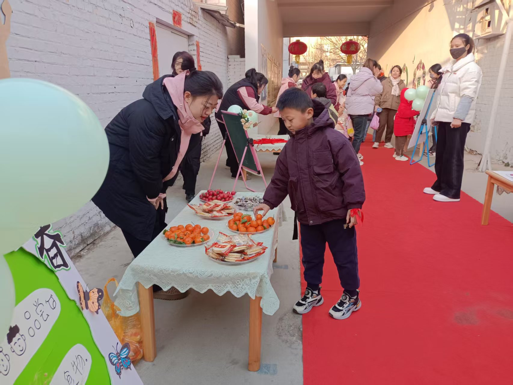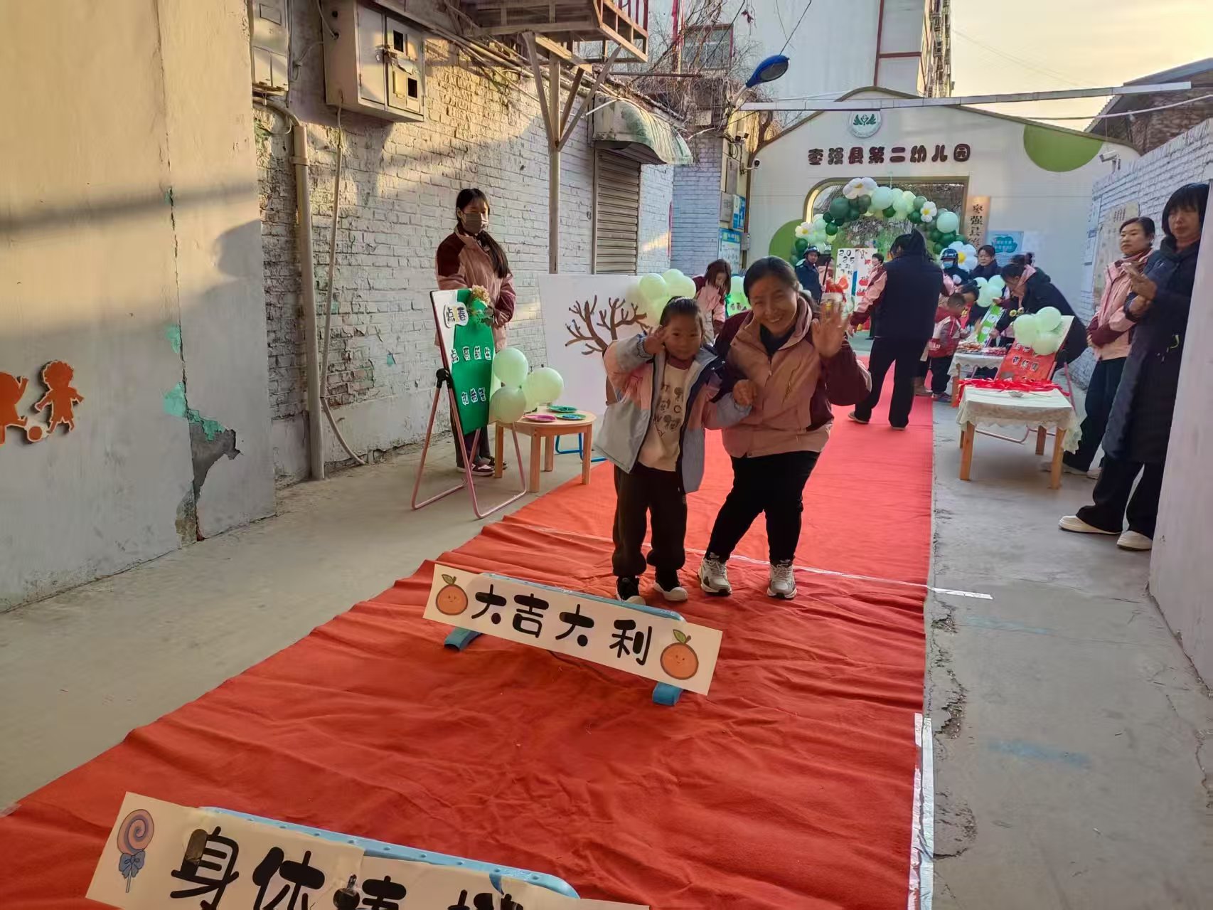 气球挂门、红毯铺地,教师们一大早就赶到幼儿园迎接孩子们的到来,现场到处充盈着幸福安康的春之气息。一路蔓延的红毯铺上满是“平安安安、大吉大利、聪明伶俐、身体棒棒、身体旺旺”的祝福,精心设置的“点春、躲春、咬春、惜春、插春”五个主题环节都蕴含着独特的文化内涵和教育意义。