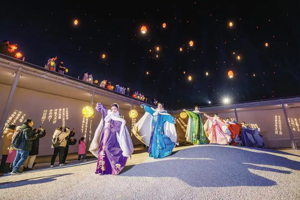 2月4日傍晚,“只有红楼梦·戏剧幻城”举行巡游点灯仪式。当21个剧场的演员手持花灯鱼贯而出,现场瞬间被点亮。演员们古装持灯,步伐轻盈整齐,花灯摇曳,光影流动。与此同时,百架无人机升空,与花灯相互辉映,幻城夜空如梦如幻,游客们纷纷拍照留念。来自上海的游客孙涵激动地说:“点灯仪式太震撼了!这里就像一场奇妙的梦境。”