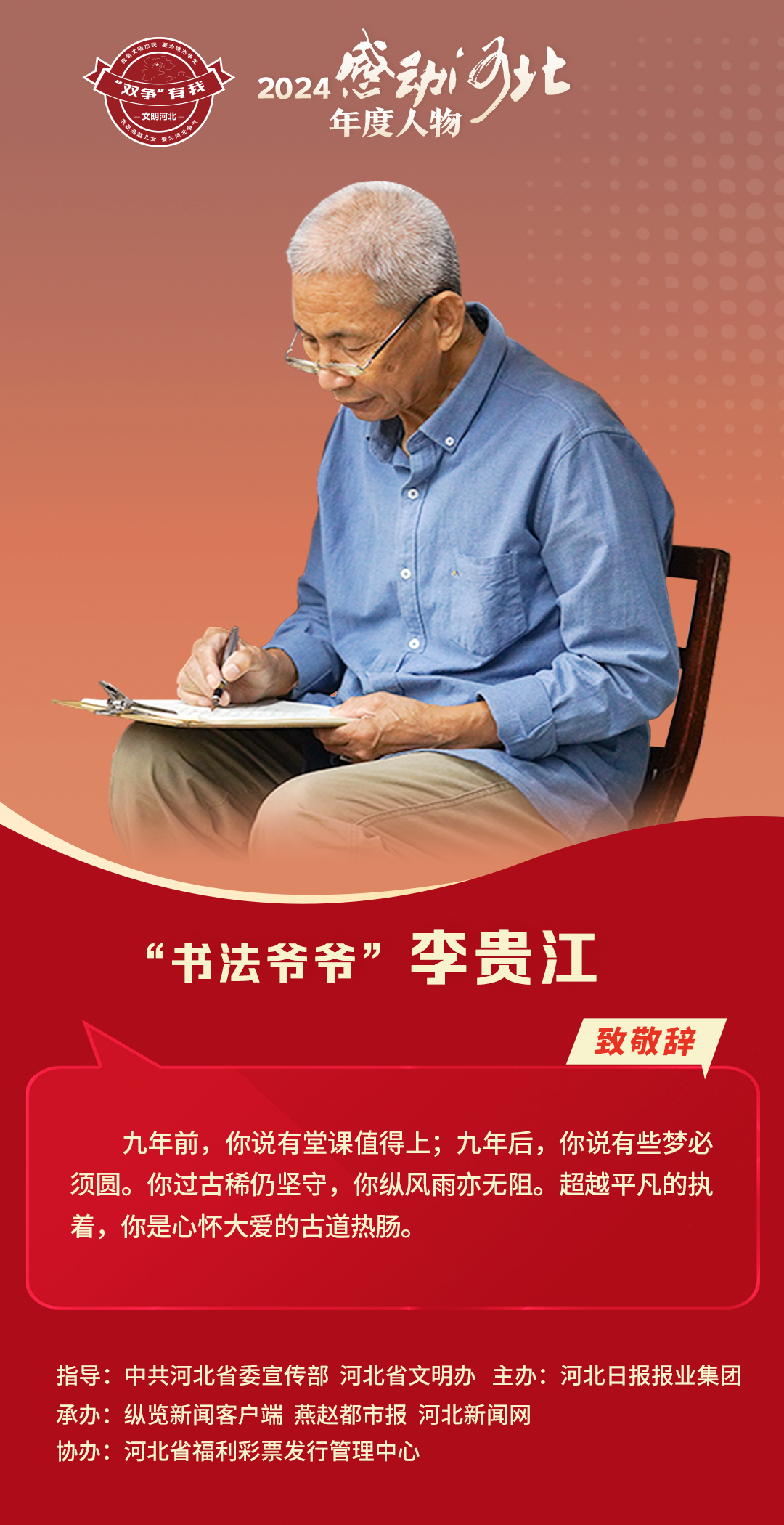 九年前,你说有堂课值得上;九年后,你说有些梦必须圆。你过古稀仍坚守,你纵风雨亦无阻。超越平凡的执着,你是心怀大爱的古道热肠。