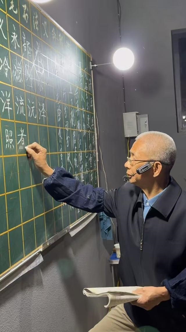李贵江在黑板上写硬笔书法。河北日报记者 董源/摄