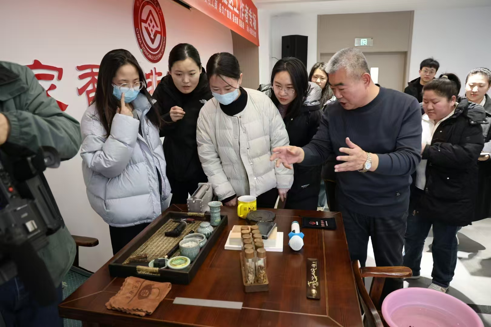 课堂上,郑连池以“什么是非遗”为切入点,系统阐释了非物质文化遗产的定义及其保护意义。他结合景县本土特色,通过图文展示与实物展演的方式,生动呈现了景县非遗代表性项目的精妙之处,包括铜胎画珐琅、古法制香技艺等,强调非遗是“活态文化”,需通过社区活动、教育传承等方式焕发新生。在“中国香文化史”专题中,郑连池以郑家香坊600余年历史为脉络,讲述了香文化从祭祀、药用到生活美学的演变历程。他特别提到,郑家香坊的贡香技艺曾为明清宫廷御用,其“天然选料、古法炮制”的工艺至今保留完整,是中国香文化史上的重要瑰宝。