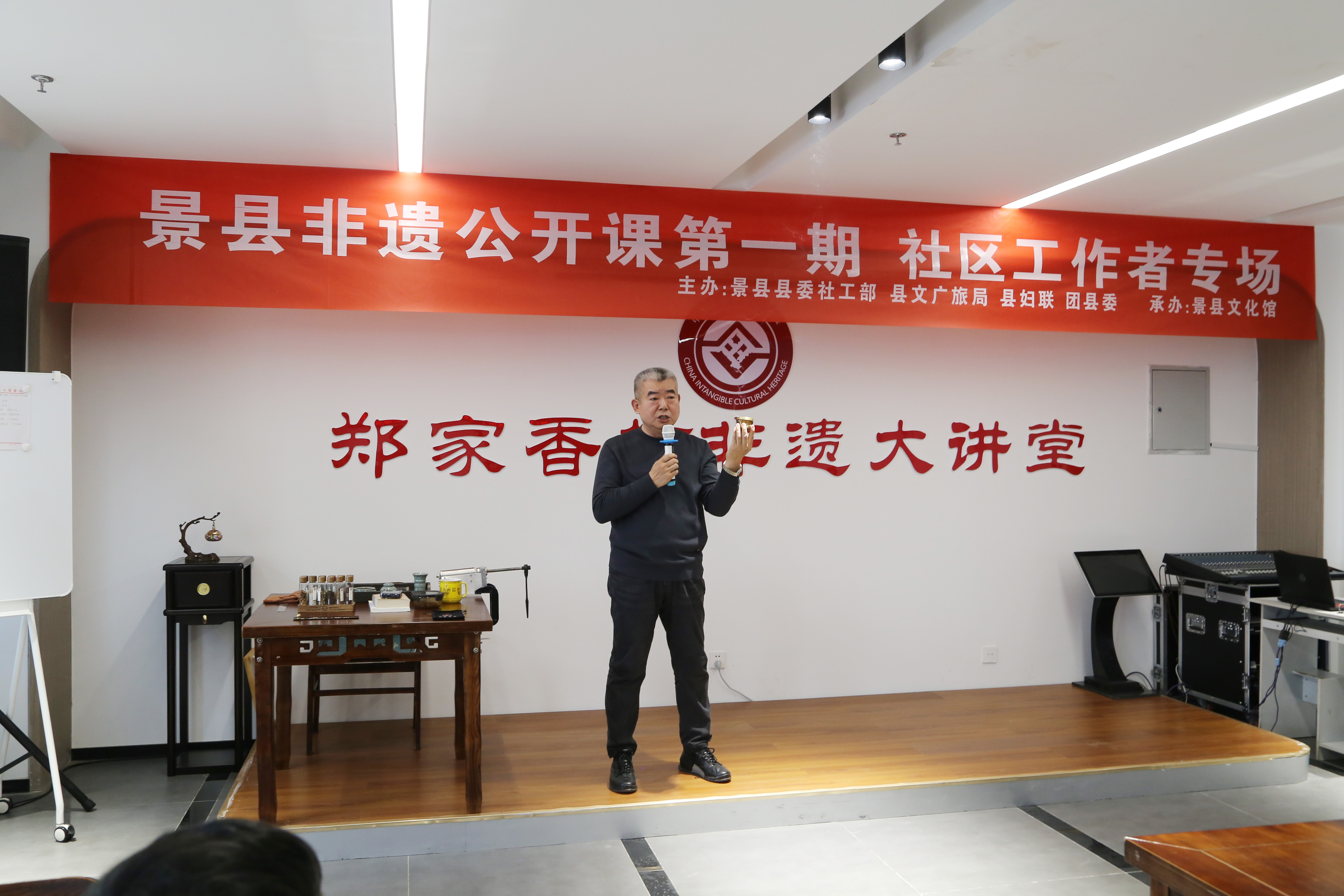 此次活动由景县县委社会工作部、县文广旅局、县妇联、团县委联合主办,景县文化馆承办,特邀郑家香坊古法贡香非物质文化遗产第十五代传承人、郑家香坊村党支部第一书记郑连池担任主讲。
