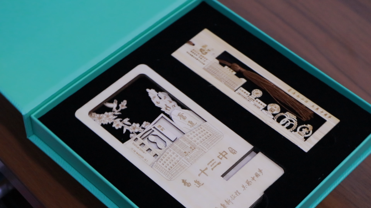 盒内右侧一枚精致的木雕书签静静守候C位的奋进钟表,象征十三中办学方向“卓越楼”三字由学校党委书记白祥友亲笔题写,激励着每一位师生不断突破、追求卓越。钟表右侧的魔方石静静诉说着十三中的成功秘诀,梦想双环与鲤鱼跃龙门景观交相辉映,创意书签作为阅读时光的温柔守护者,将帮你标记阅读进度每一次的停留都是为了更好的出发。