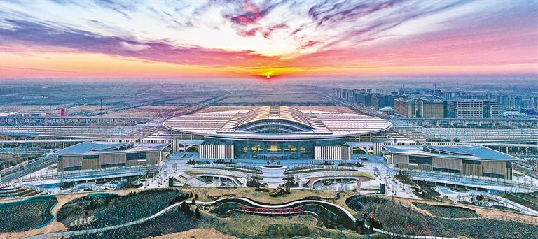 河北雄安站晨景。雄安站是河北雄安新区开工建设的第一个重大基础设施项目,2018年12月1日开工,2020年12月27日开通运营,是连接京雄的重要交通枢纽。陈世豪摄(中经视觉)