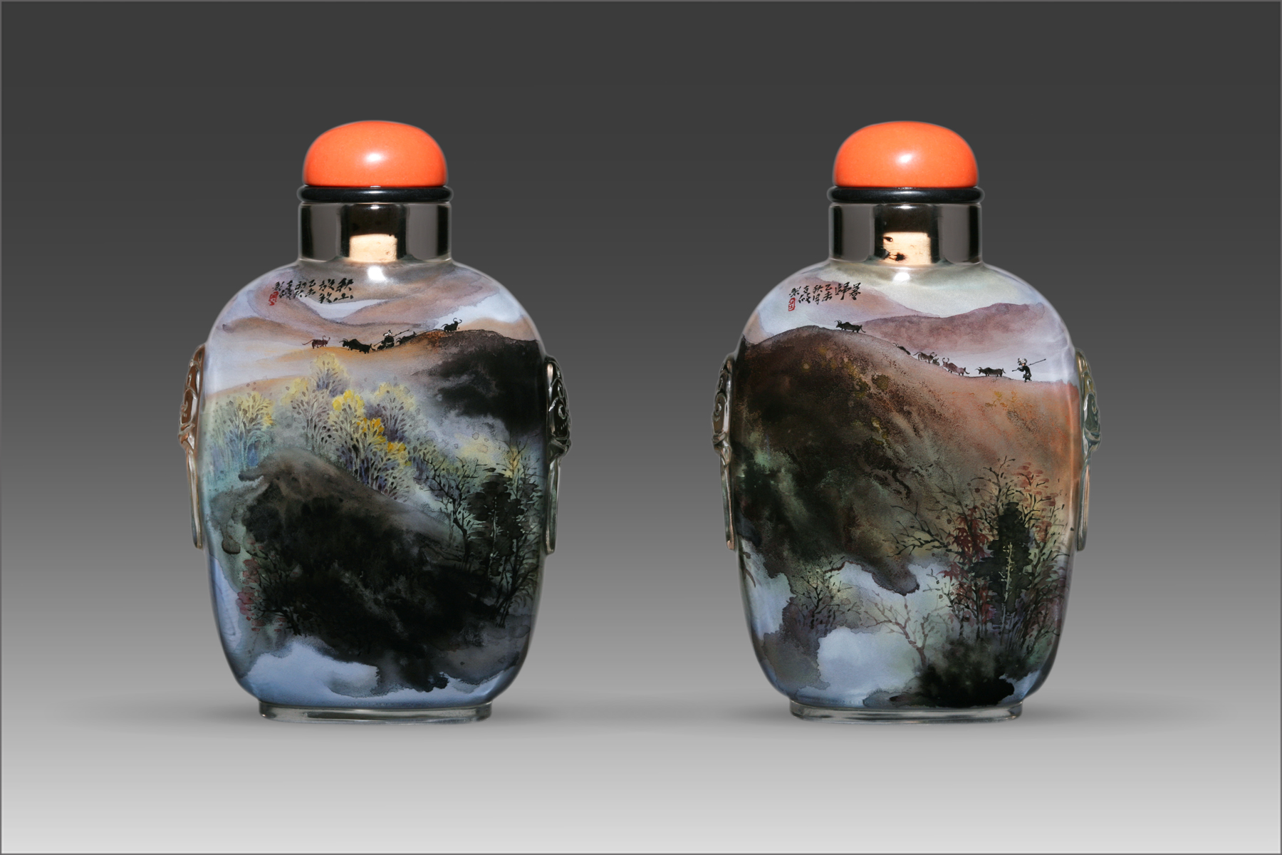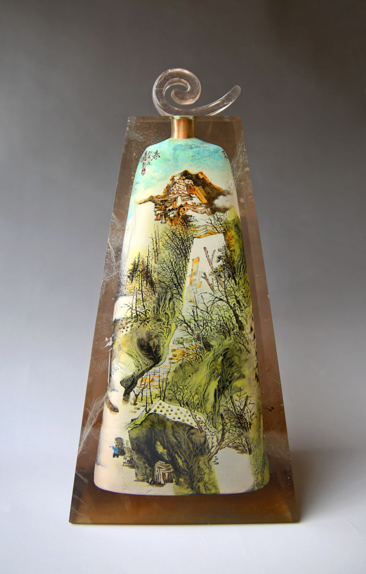 初见苑仕甲的内画作品,那晶莹剔透的材质与细腻入微的笔触完美融合,作品直抵人心,仿佛是一面澄澈的镜子,能映照出观者的内心世界。在这小小的内画之中,山水景致栩栩如生,似有无尽的故事与情感在其中涌动。每一处山峦的起伏,每一条溪流的蜿蜒,都仿佛蕴含着创作者的情感寄托,吸引着人们去探寻其背后的深刻意义。