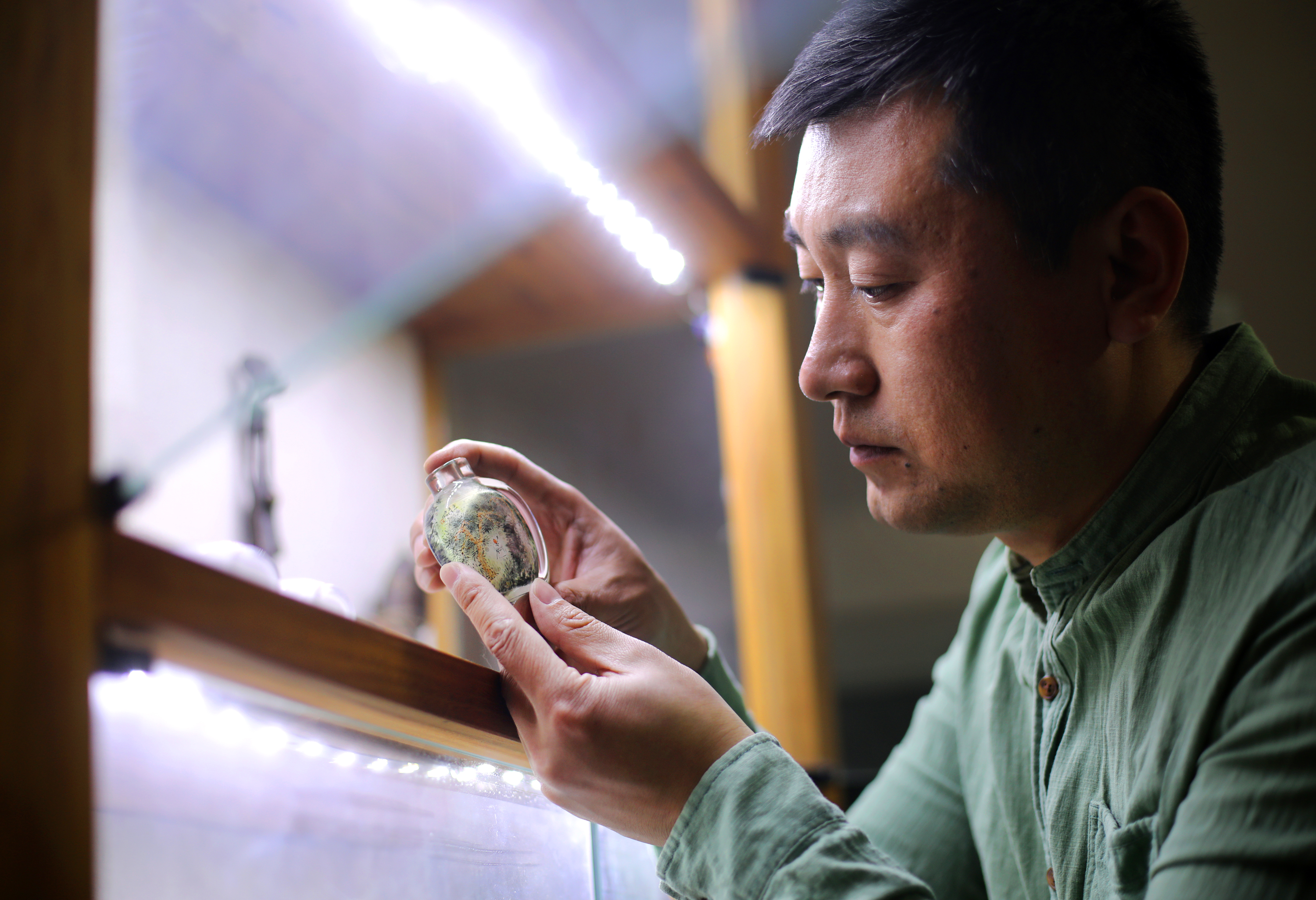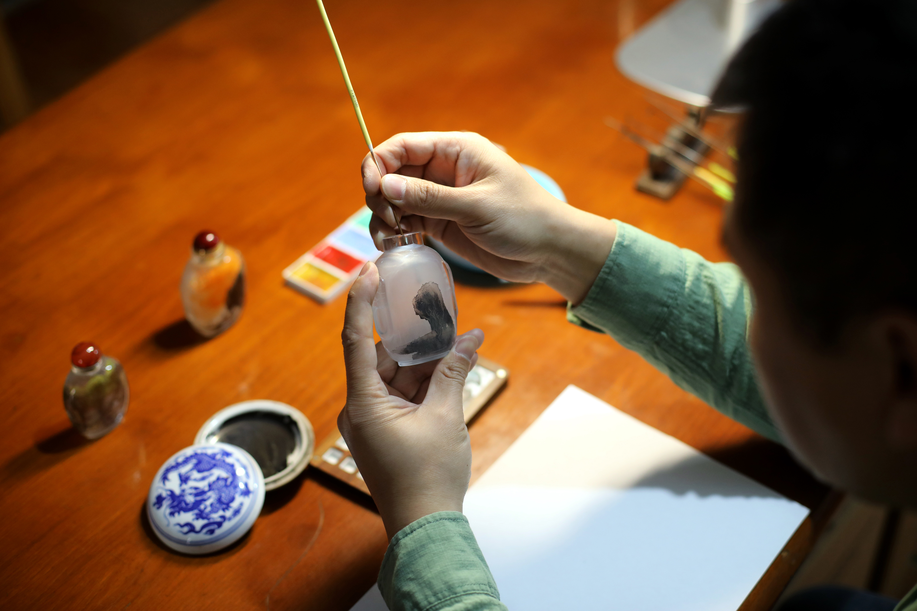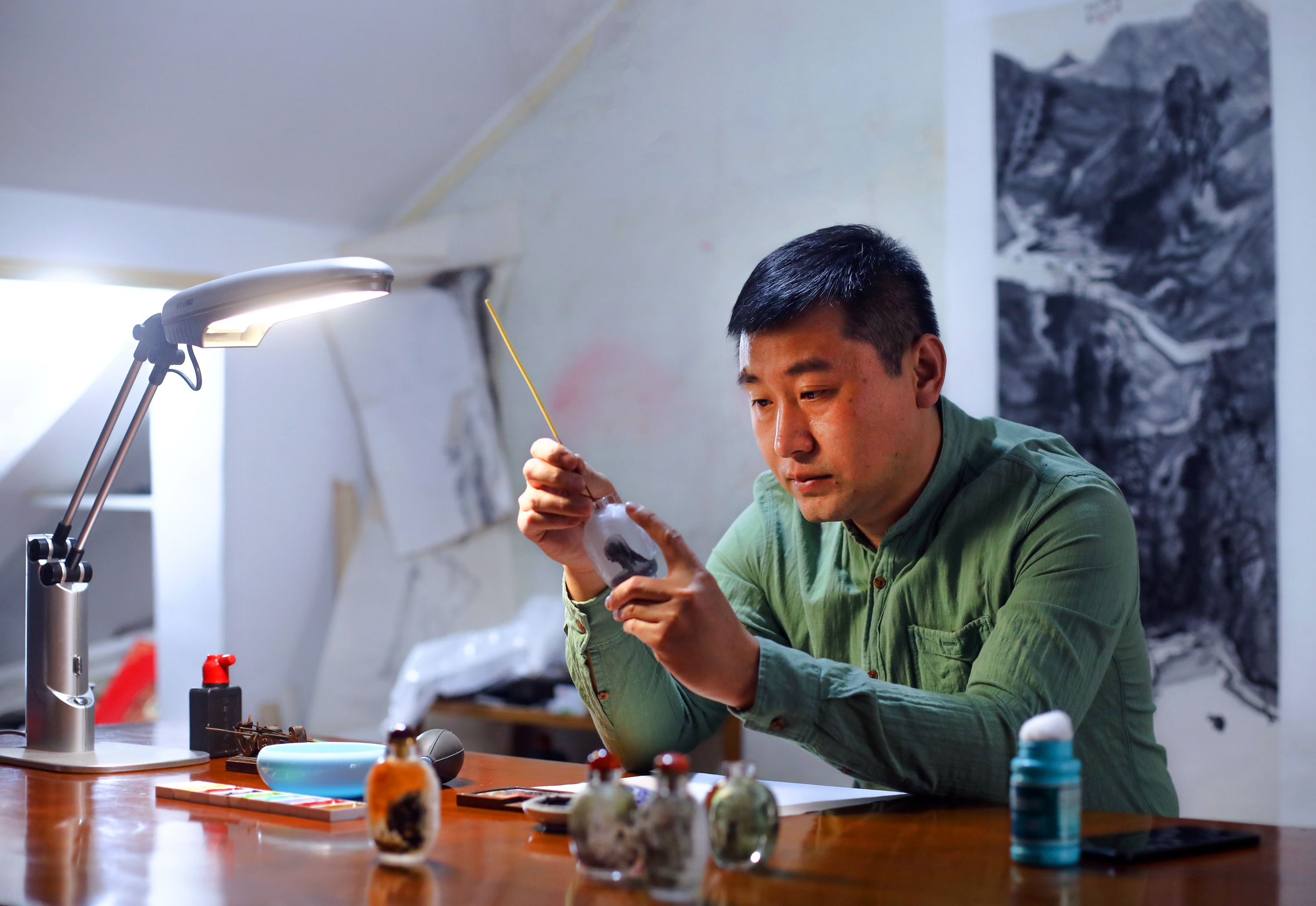 内画艺术,其难点就在于在狭小的空间内反手作画,对技巧、耐心与专注力都有着极高的要求。在这个追求速度与效率的时代,苑仕甲却能坚守内心,专注于这门传统技艺。