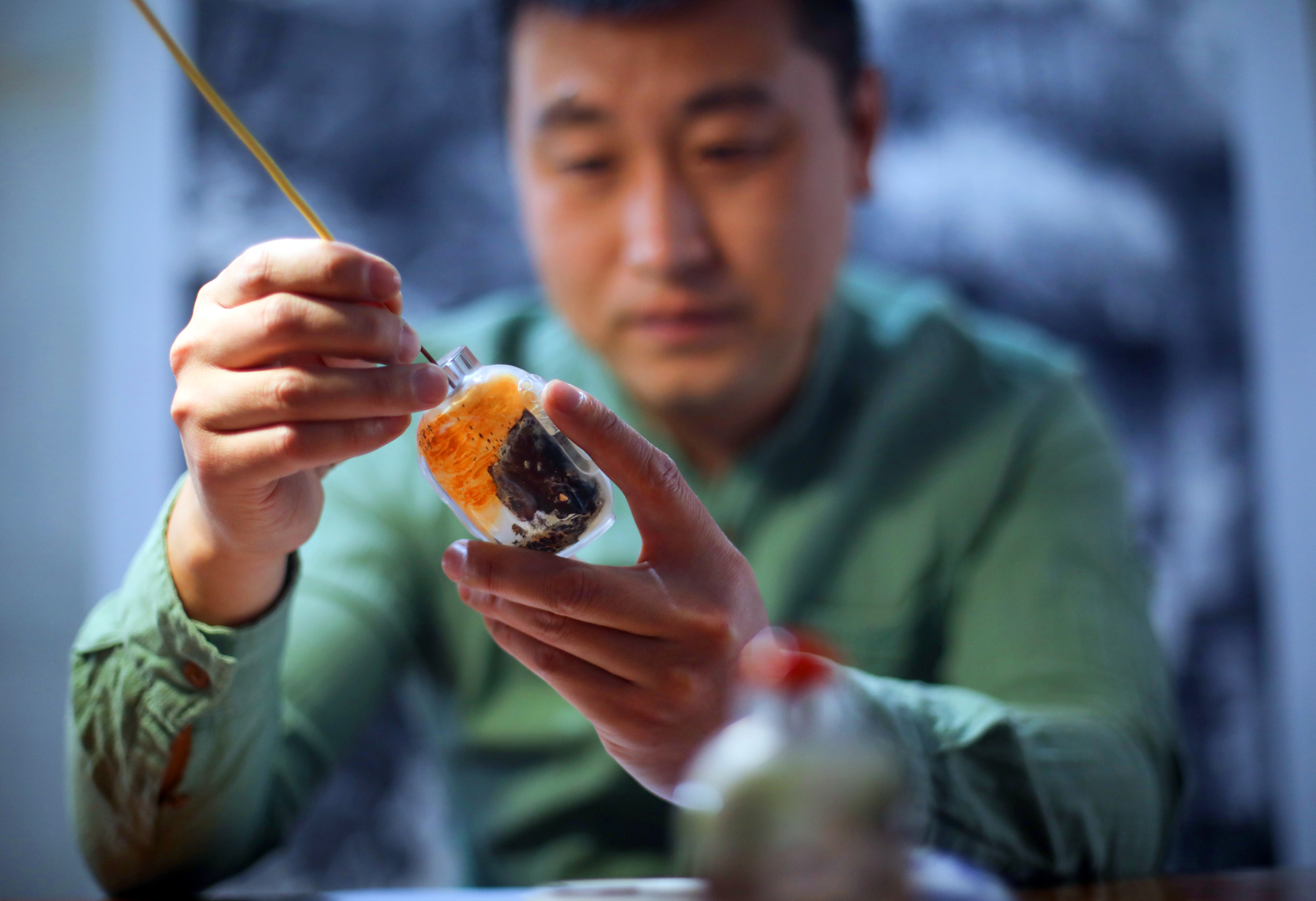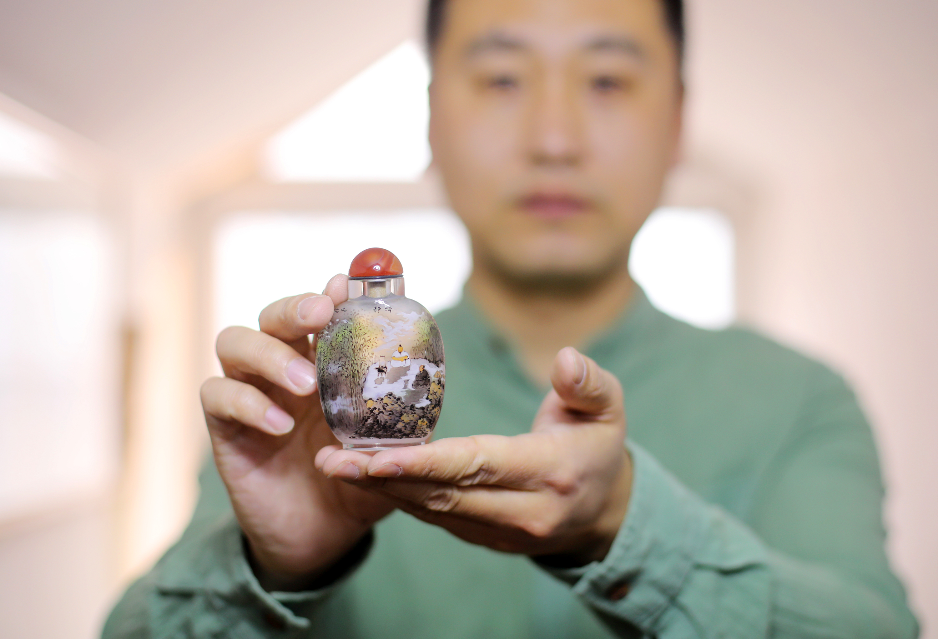 谈及与内画的初次邂逅,苑仕甲眼中满是深情:“那是我初中时期,在饶阳县文化馆看到一位老师傅,拿着特制的笔在小小的鼻烟壶里画画。我当时就像被施了魔法一样,挪不动脚步。看着那原本空空如也的壶内,在老师傅笔下渐渐出现山川河流、花鸟鱼虫,我心里就想着,这简直太神奇了,我一定要学会这门手艺。”