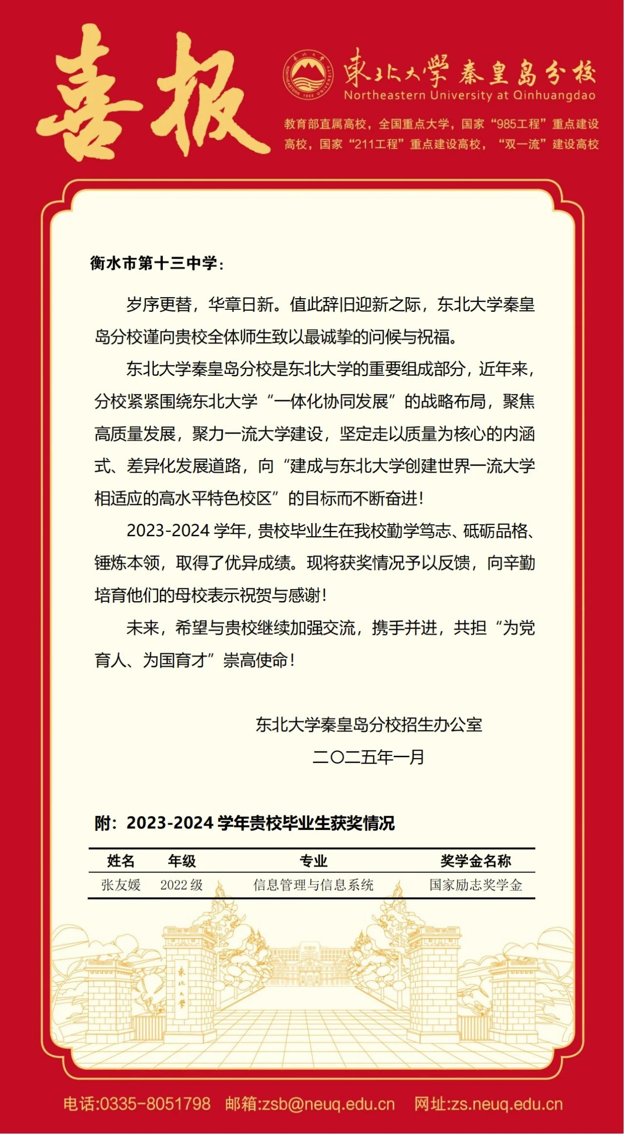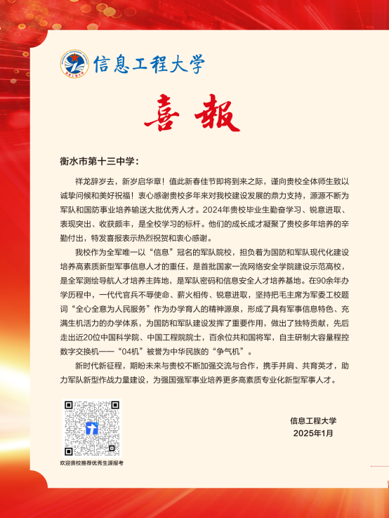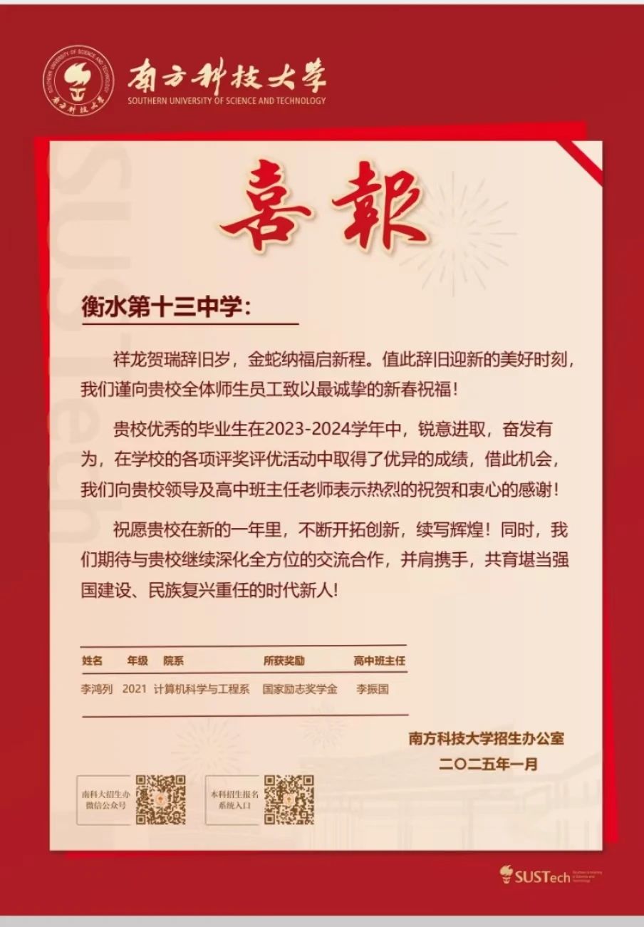 学期伊始,喜报频传!近日,四川大学向衡水十三中发来喜报,祝贺该校毕业生杜昊学荣获国家奖学金。就读于信息工程大学的衡水十三中毕业生董硕、王耀辉荣获2024年度“四有”优秀学员。就读于南方科技大学的衡水十三中毕业生李鸿列荣获国家励志奖学金。东北大学秦皇岛分校发来喜报,祝贺衡水十三中毕业生张友媛荣获国家励志奖学金。