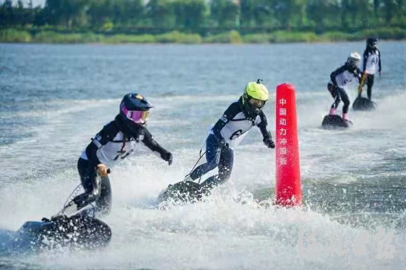 2024年8月17日,在揽月湾旅游景区举办的2024年中国动力冲浪板公开赛(河北曹妃甸站)中,参赛选手上演水上“速度与激情”。曹妃甸文旅集团供图