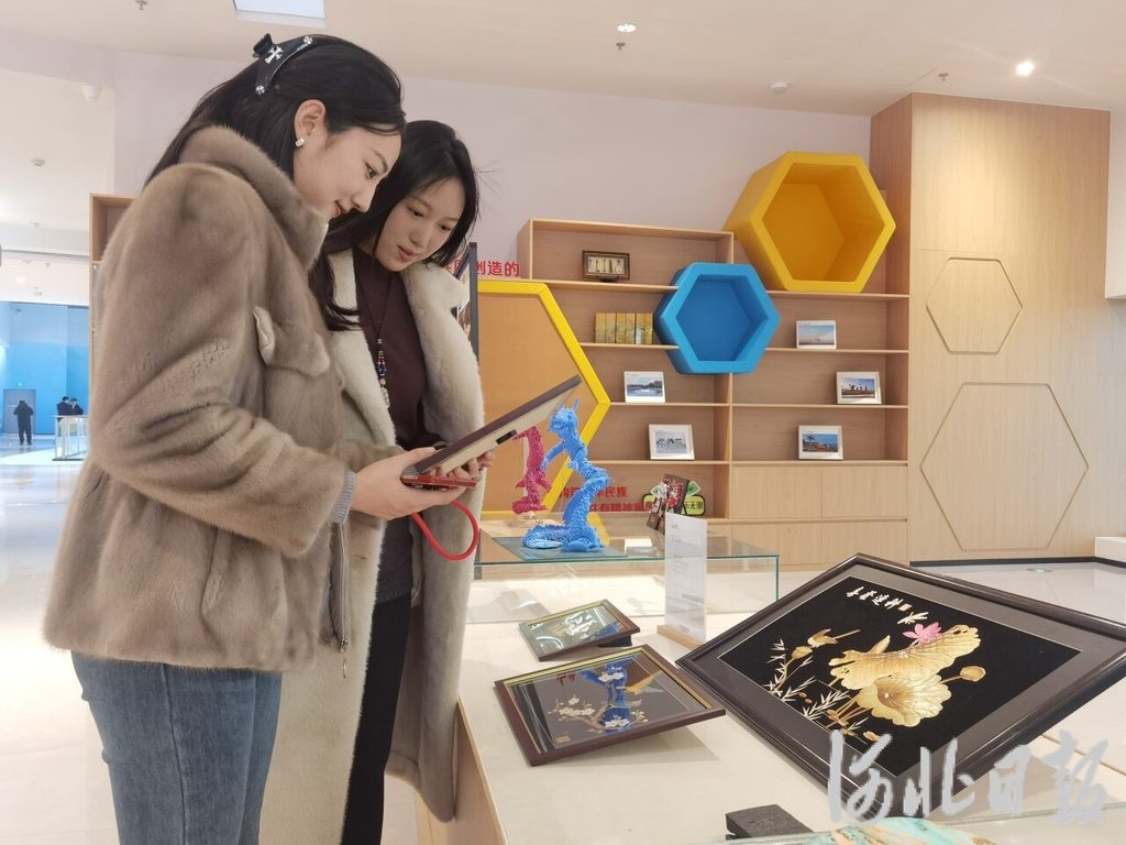 2024年12月4日,游客在曹妃甸城市馆欣赏芦苇画作品。河北日报记者王育民摄