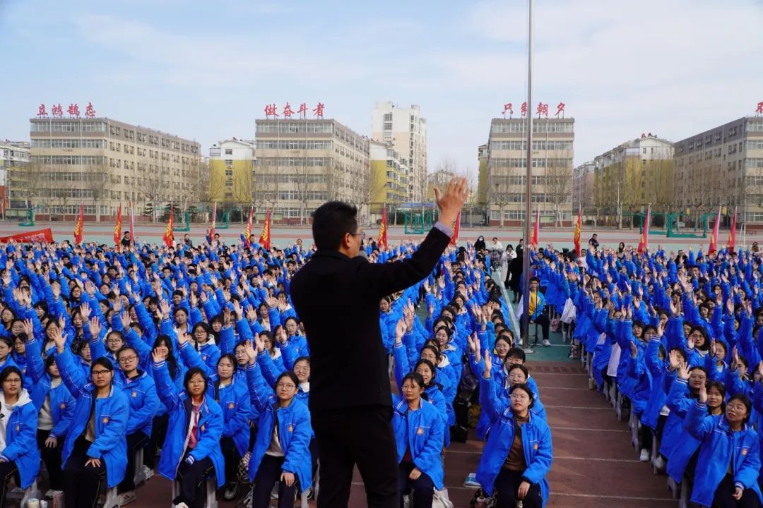 励志演讲后,高三各班班主任走上前台,为弟子们奋战高考加油打气,输送勇敢向前的力量。班主任祝福后,全体高三学生在领誓人的带领下庄严宣誓。千余名学子紧握右拳,目光坚定,誓言声如春雷激荡。