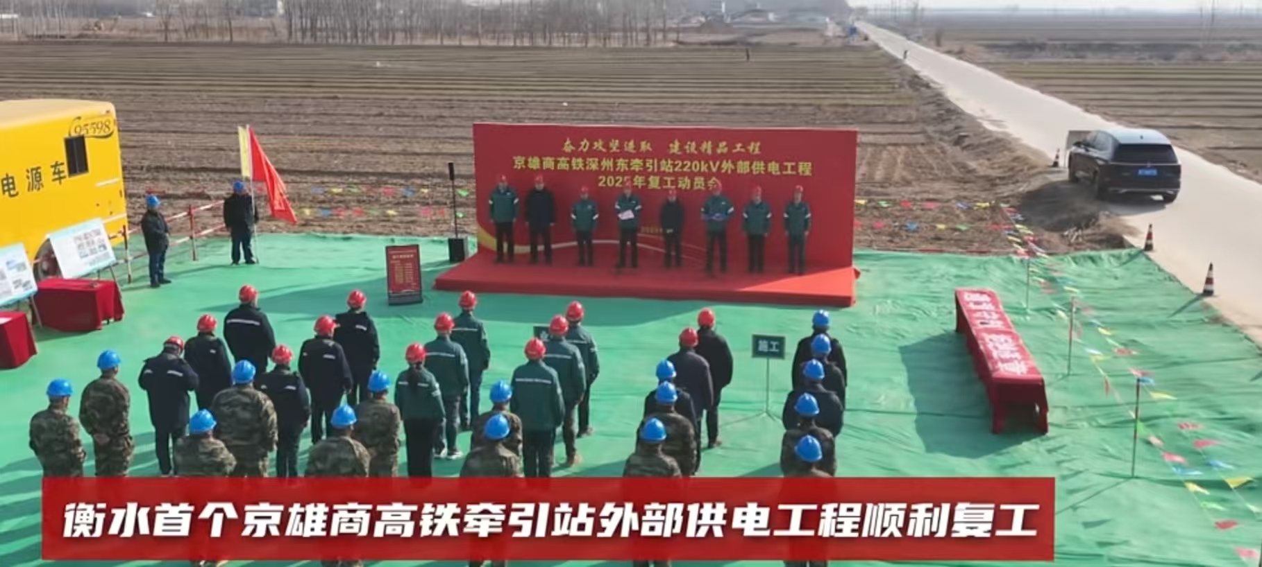 近日,随着施工机械的轰鸣声再度响起,衡水市京雄商高铁首座牵引站外部供电工程正式复工。作为国家“八纵八横”高速铁路网京港(台)通道的重要组成部分,该工程的顺利推进标志着衡水段高铁配套电力设施建设迈入关键阶段,为京雄商高铁全线如期通车奠定重要基础。