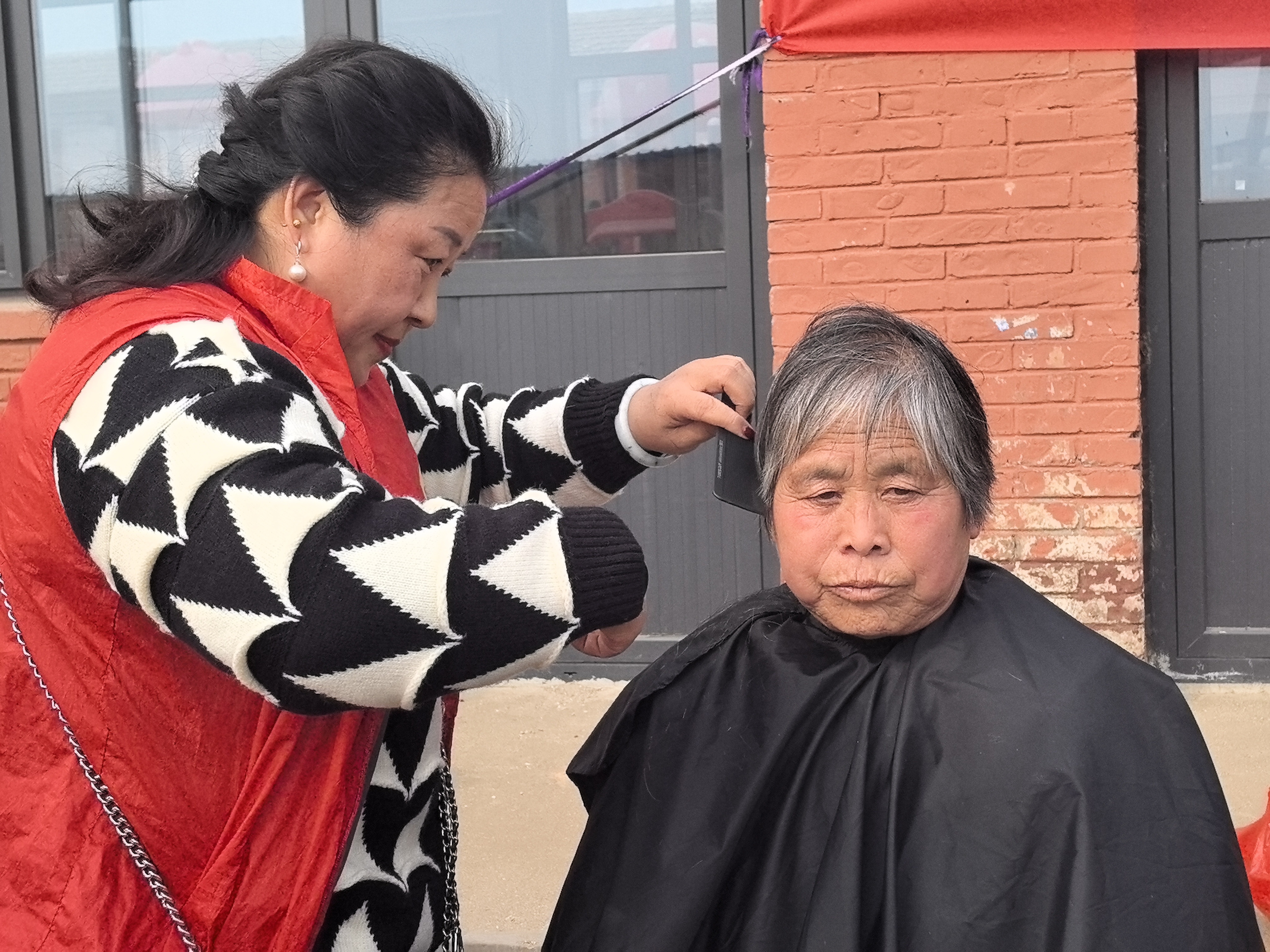 此外,演出现场由志愿者组成的服务团队为村内老人提供免费理发服务,志愿者们手法娴熟,根据老人们的需求,精心设计发型,并时不时与老人们唠着家常,现场气氛其乐融融。