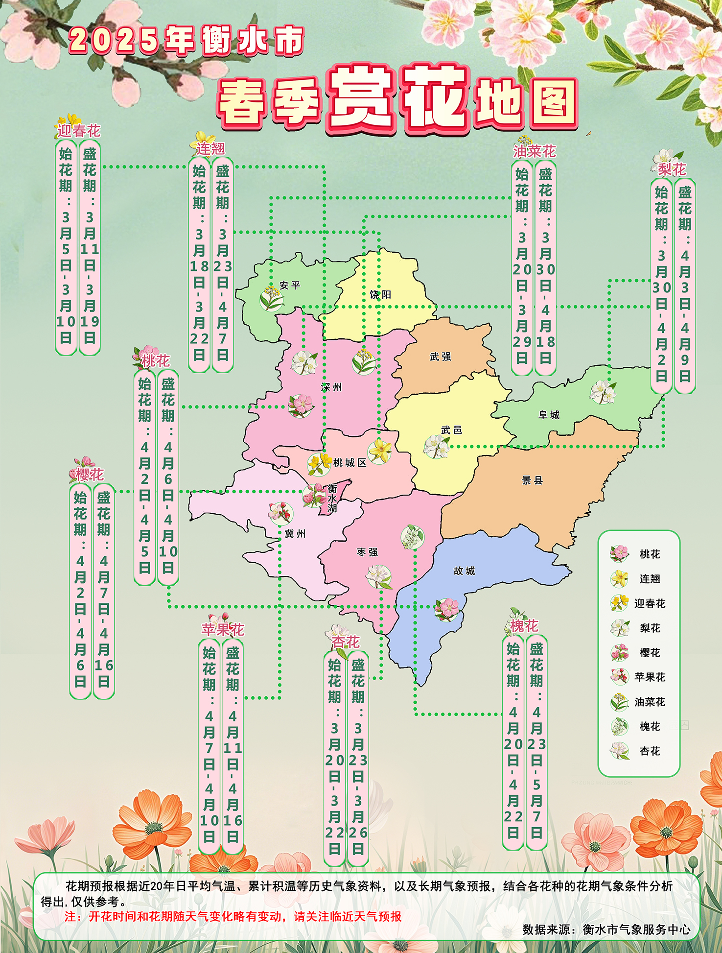气候变化对花卉生长有着不可忽视的影响,因此,衡水市气象局技术人员不仅基于近20年的日平均气温、累计积温等历史气象资料,更是结合了最新的气象预报,通过科学分析,精心制作了2025年衡水市春季赏花地图,地图中详细列举了迎春花、连翘、油菜花、樱花、苹果花、梨花、杏花、桃花、槐花等九种花卉的始花期和盛花期,这些花卉的花期时间精确到天,公众可选择心仪的花卉,与亲朋好友一同沉醉于花的海洋。