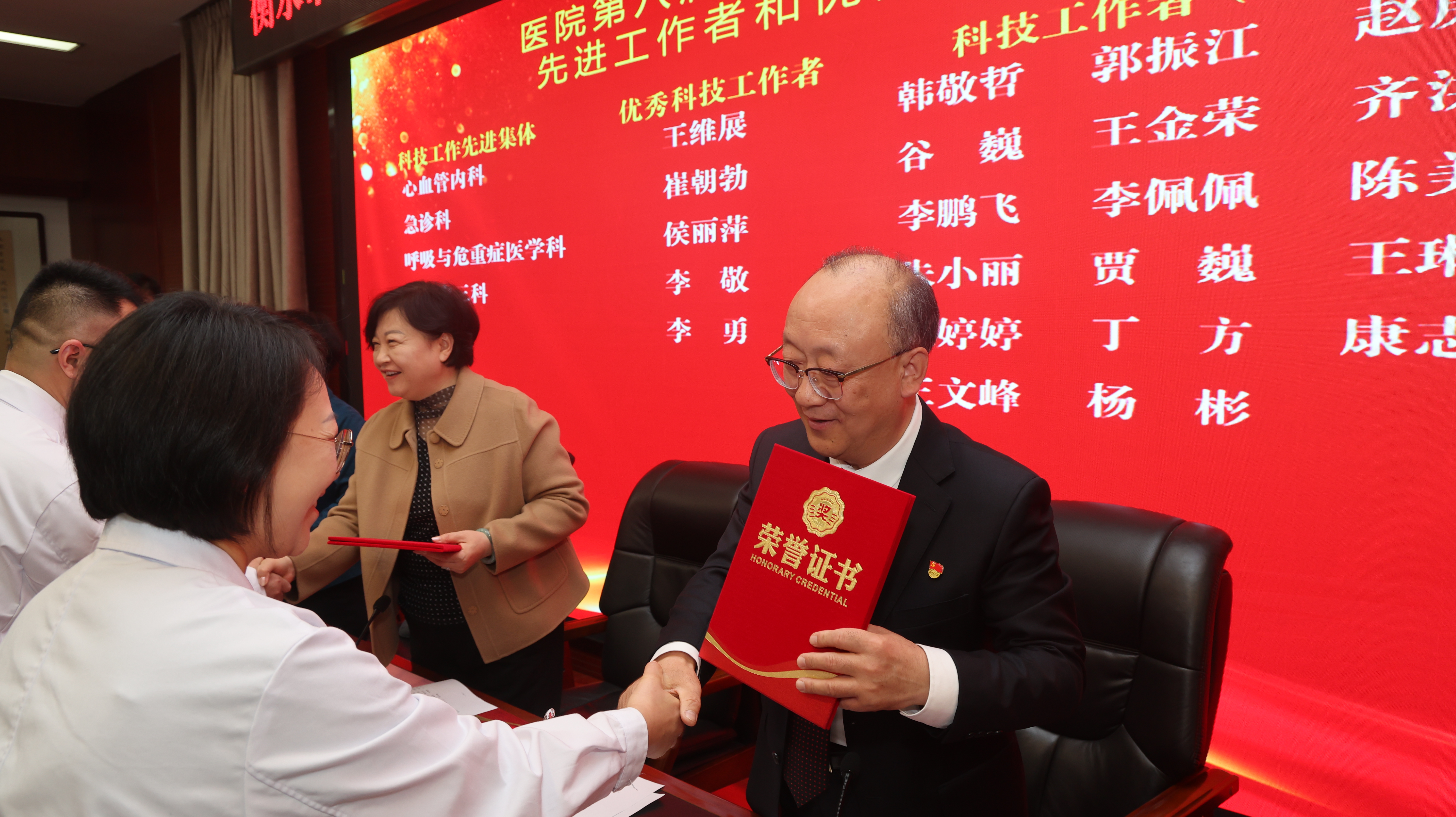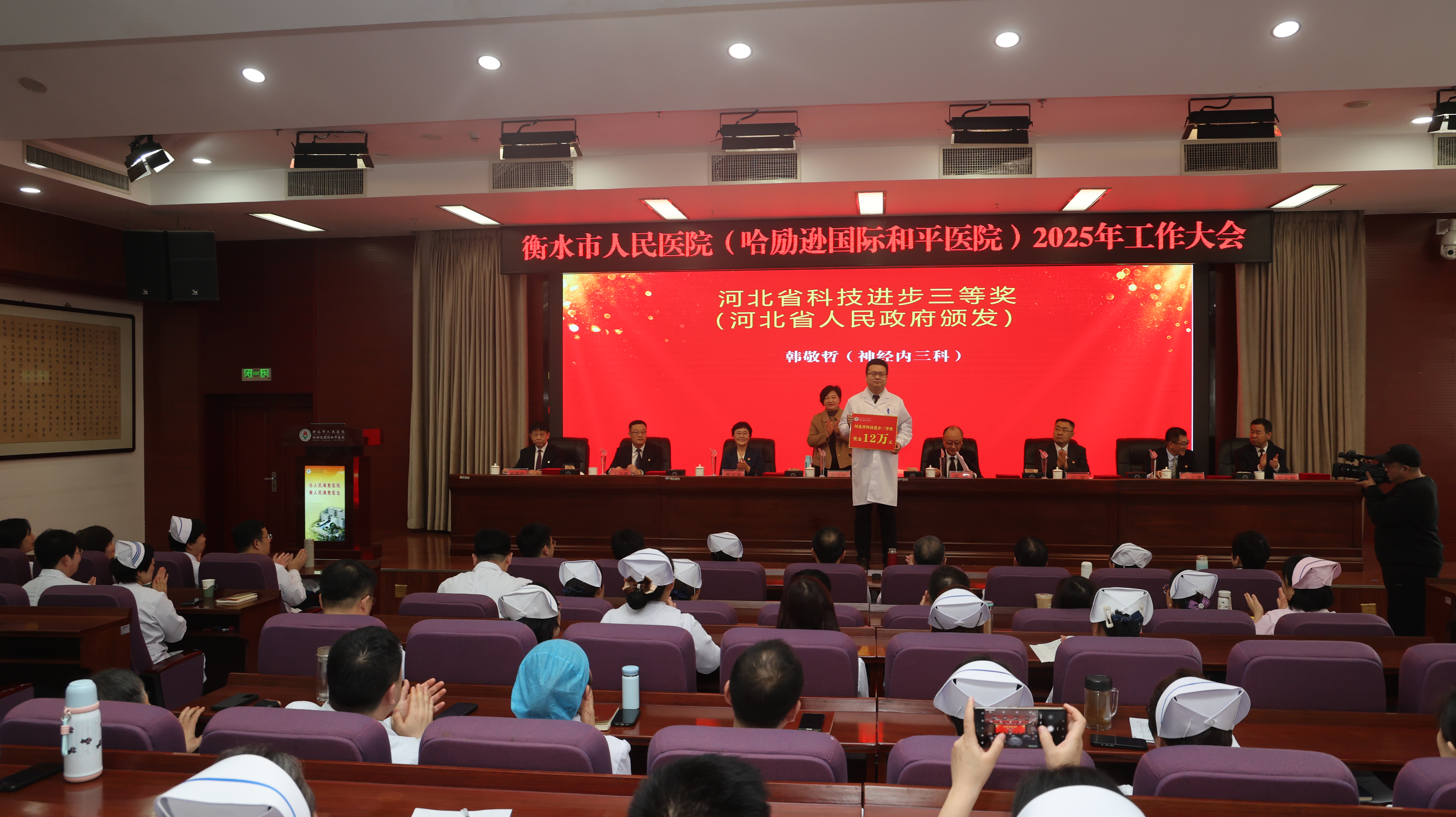自2020年起,哈院党委大力践行“学研兴院”“人才强院”战略,制定《中共衡水市人民医院委员会科技成果及科技论文奖励的规定》,连续三年开展“学研医院建设年”“学科建设年”“学科体系建设年”主题年活动,通过建立亮分打榜、绩效评价等机制,持续加大科研奖惩力度,为科研创新注入强劲动力。自2023年起,急诊科王维展团队、神经外科孙召胜团队、血液内科李英华团队勇攀科研高峰,荣获河北省科技进步三等奖,成功填补我市医疗卫生战线五年未获省级科技进步奖的空白。2024年,神经内三科韩敬哲团队同样凭借深厚的专业素养和持之以恒的科研精神,在科研道路上砥砺前行,为哈院再添荣誉,荣获河北省科技进步三等奖。院党委及时给予12万元的奖励,以表彰他们的卓越贡献。