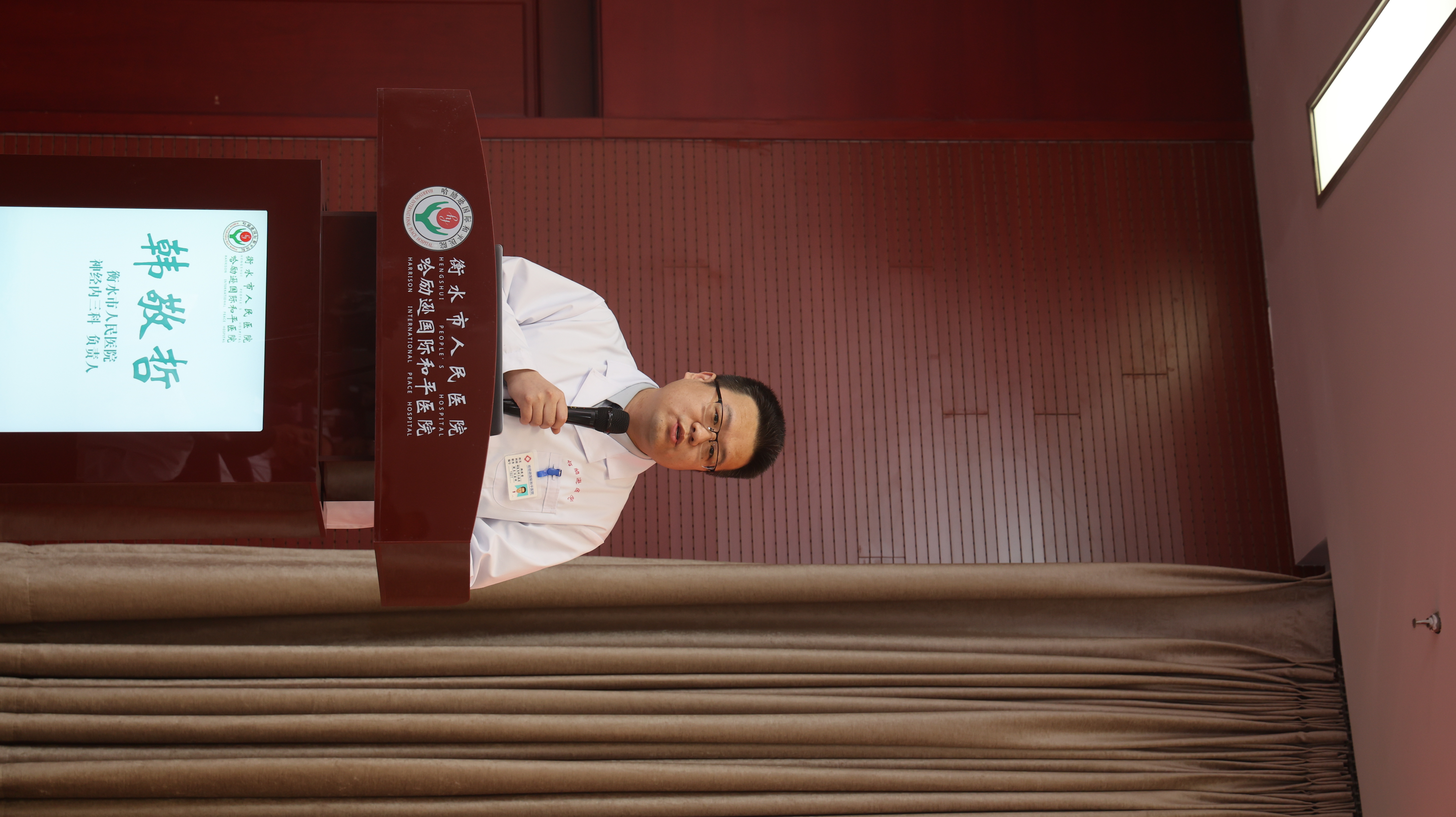 河北省老年医学会神经罕见病专委会副主任委员、衡水市医学会罕见病学组秘书,哈院神经内三科负责人韩敬哲博士,以第一作者或通讯作者SCI收录文章高达40余篇,单篇最高影响因子一再创下衡水新高。他以《遗传性神经肌肉病的临床病理特征和关键分子机制研究及其治疗策略》荣获河北省科学技术进步奖。本项目对遗传性神经肌肉病进行系统的临床和基础研究,切实提高了临床医生对该病的认识和诊断水平,在临床应用推广后,备受瞩目。图为韩敬哲博士作典型发言。