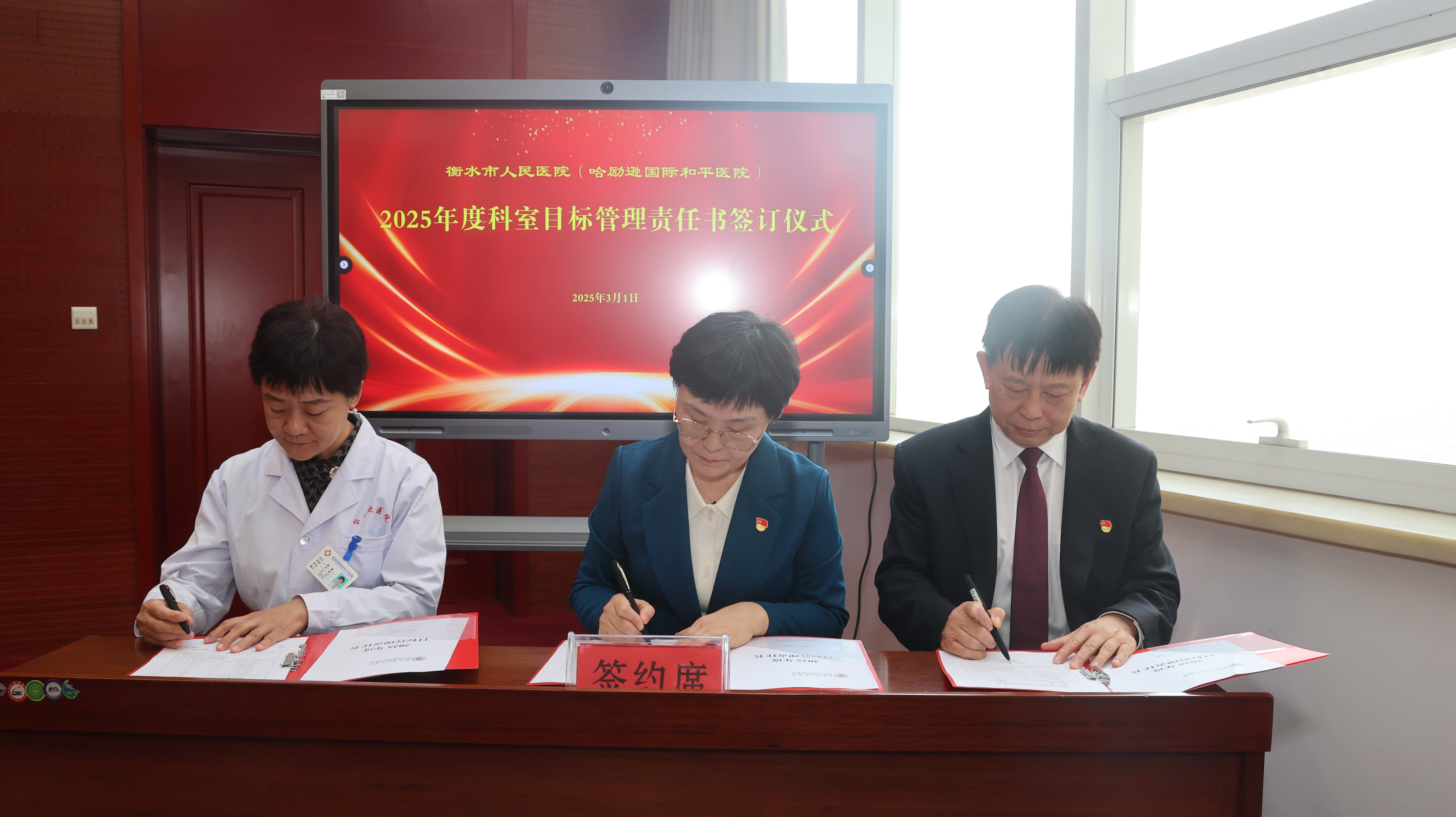 用好考核“指挥棒”,激励哈院人开拓进取干事创业。图为衡水市人民医院(哈励逊国际和平医院)党委副书记、院长曹双清,党委委员、副院长崔朝勃,与产科主任张燕签订2025年度科室目标管理责任书。