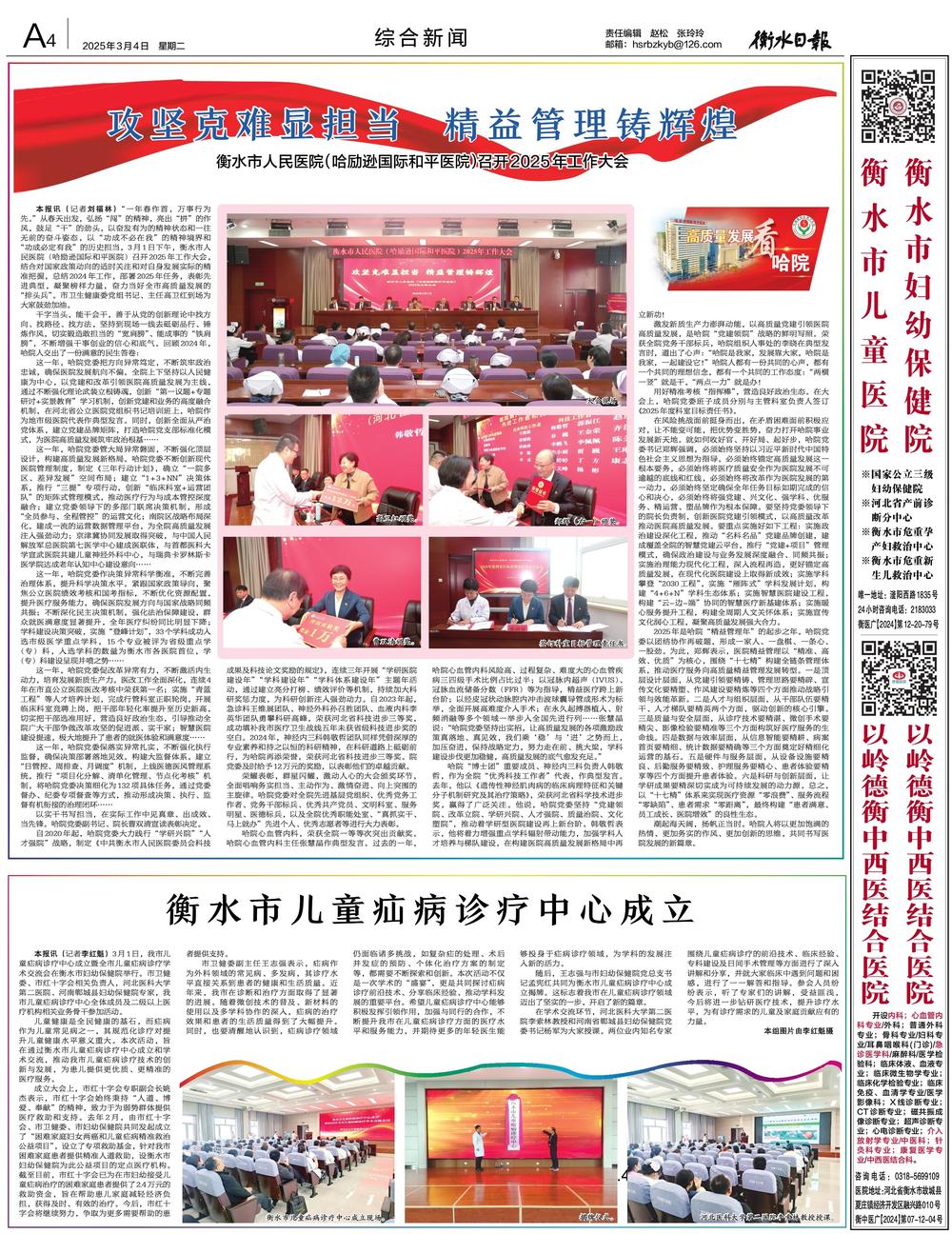 这一年,哈院党委作决策异常科学衡准,不断完善治理体系,提升科学决策水平。紧跟国家政策导向,聚焦公立医院绩效考核和国考指标,不断优化资源配置,提升医疗服务能力,确保医院发展方向与国家战略同频共振;不断深化民主决策机制,强化法治保障建设,群众就医满意度显著提升,全年医疗纠纷同比明显下降;学科建设决策突破,实施“登峰计划”,33个学科成功入选市级医学重点学科,15个专业被评为省级重点学(专)科,入选学科的数量为衡水市各医院首位,学(专)科建设呈现井喷之势……