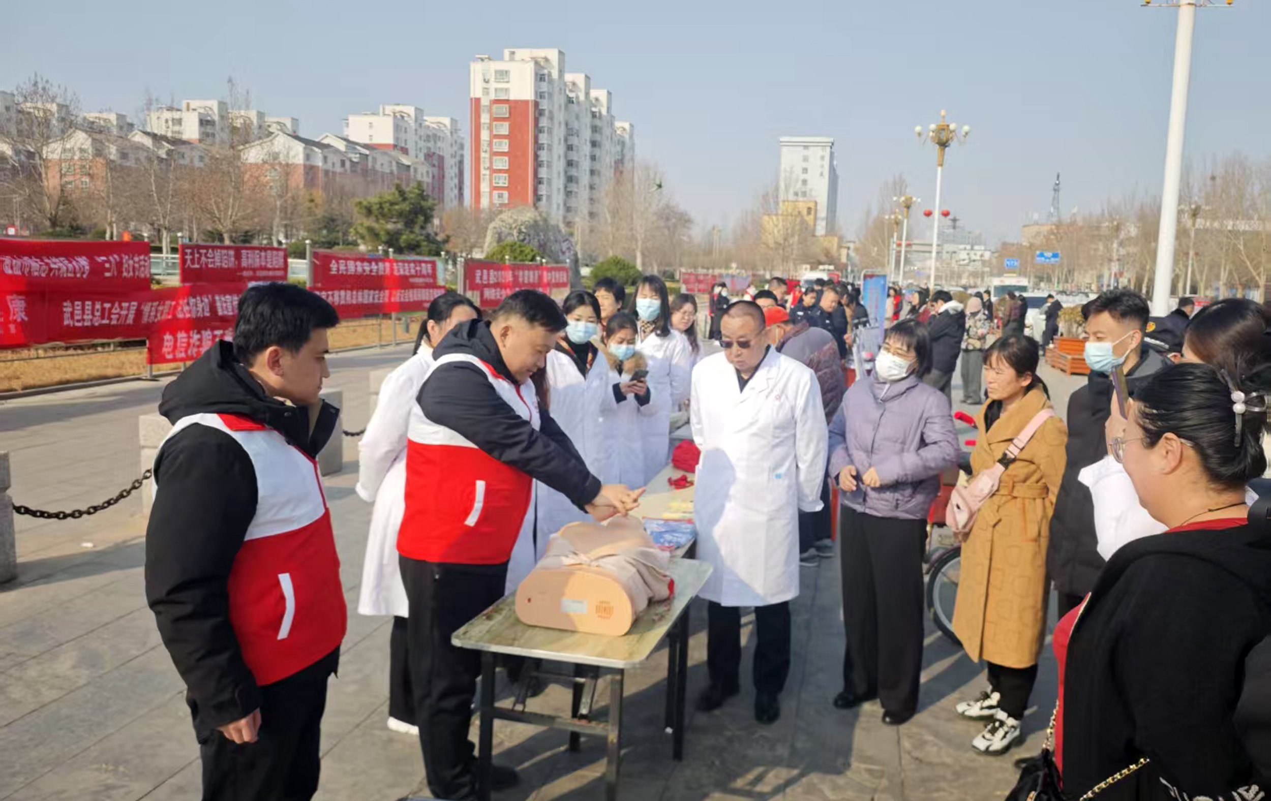 县卫健系统的志愿者们则现场演示心肺复苏、海姆立克急救法等实用急救技能。他们一边耐心细致地演示操作步骤,一边详细讲解急救要点和注意事项,还“手把手”指导居民进行实践操作,帮助他们掌握规范的急救动作,让急救知识真正深入人心。