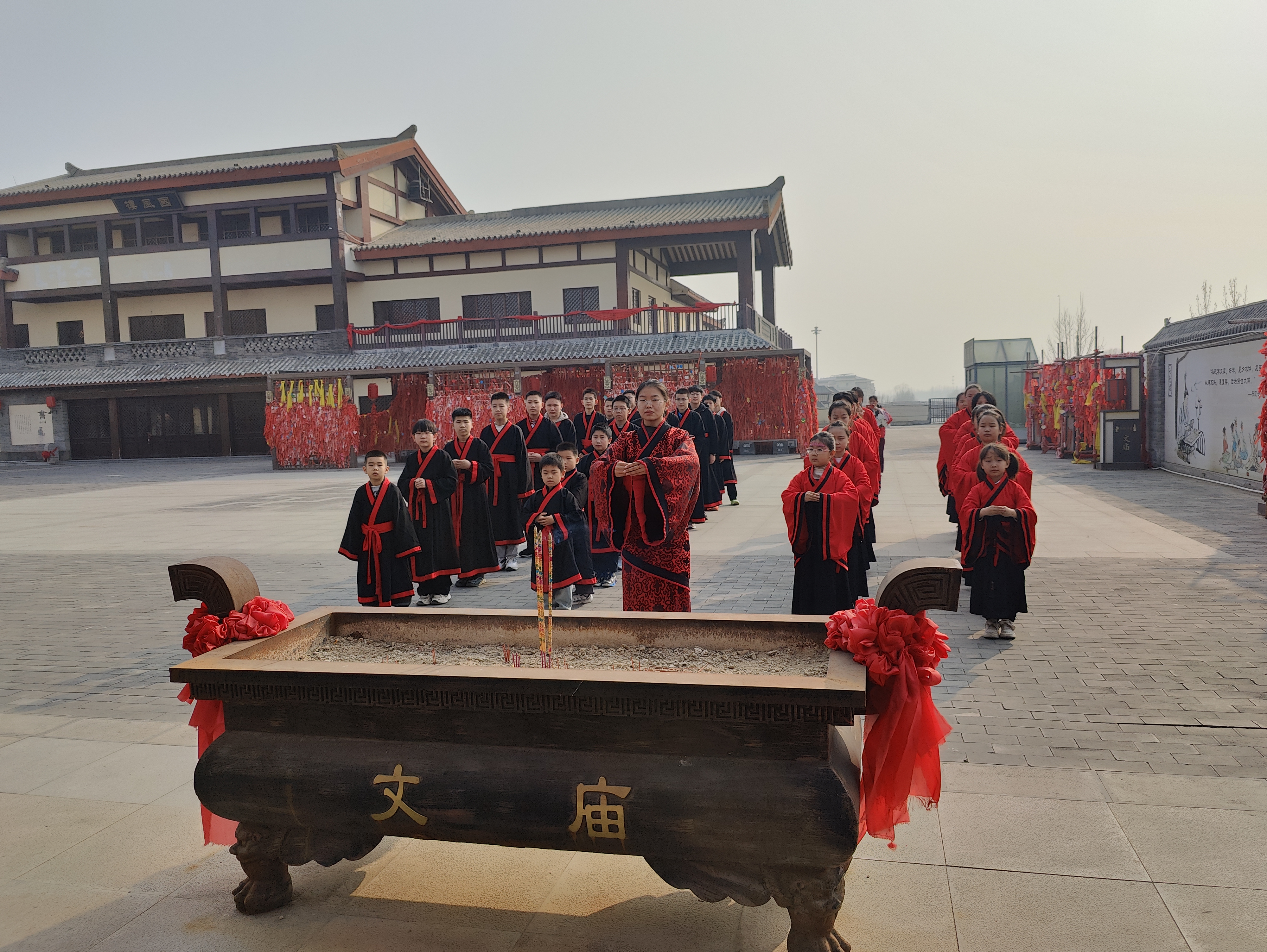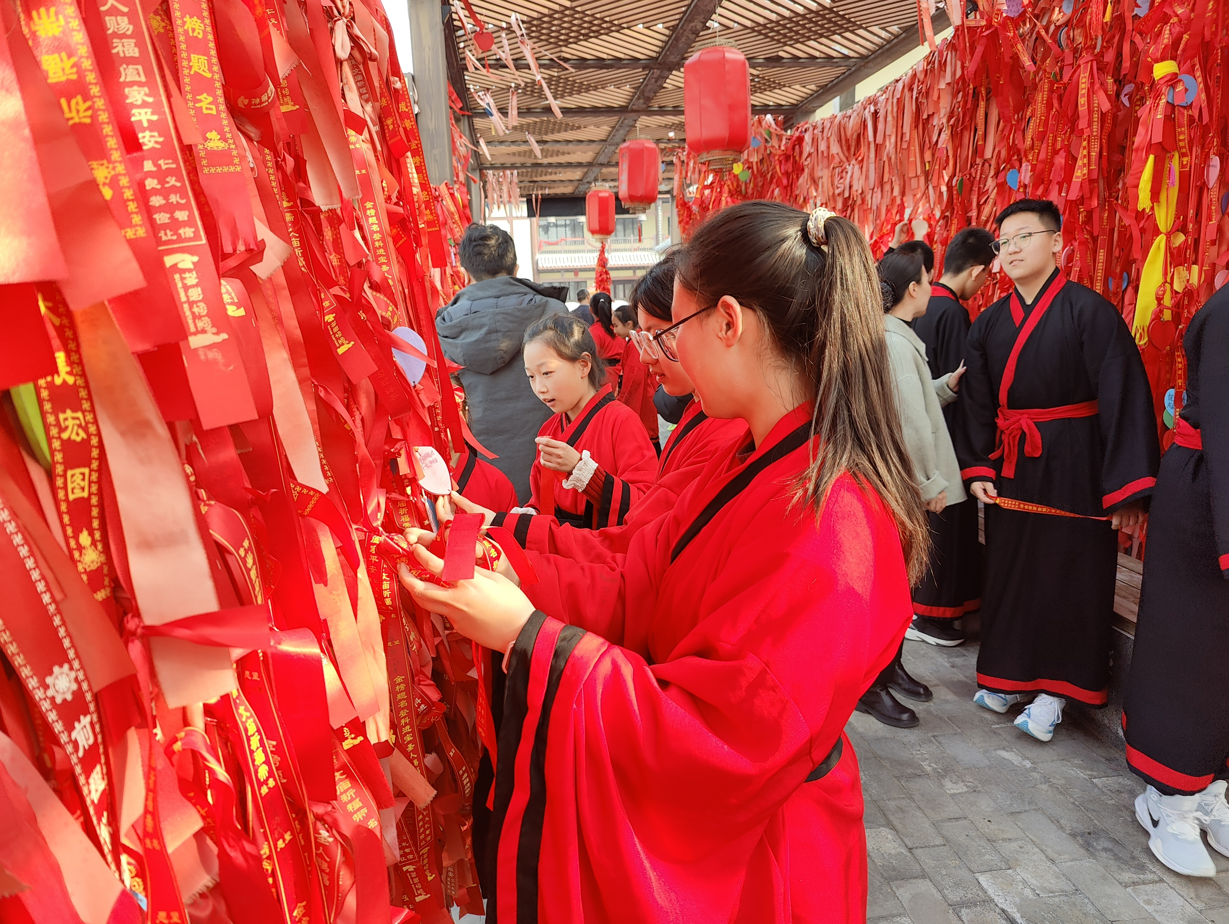 当日,青少年们身着汉服,开启了一场别开生面的传统文化之旅。大家整齐列队,在学堂正门口认真跟随老师参加朝阙礼,感受古代礼仪的庄严与神圣;在文庙前体验拜师礼的庄重仪式,学习尊师重道的精神;在状元廊系下承载着心愿的红绳,寓意着对未来的美好期许。
